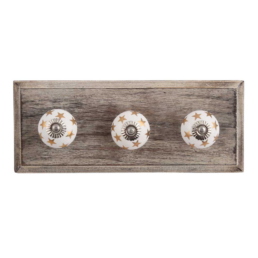 Golden Star Ceramic Wooden Hook. A Perfect Complement to the Soft Tone of the Wood are these White Traditional Hat & Coat Hook Made of Genuine Porcelain and Brass. It can be use to Hang Jewellery, Leashes, Towels, Scarves, Light Weight Sweaters, Caps Etc.