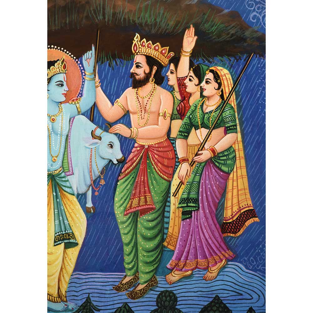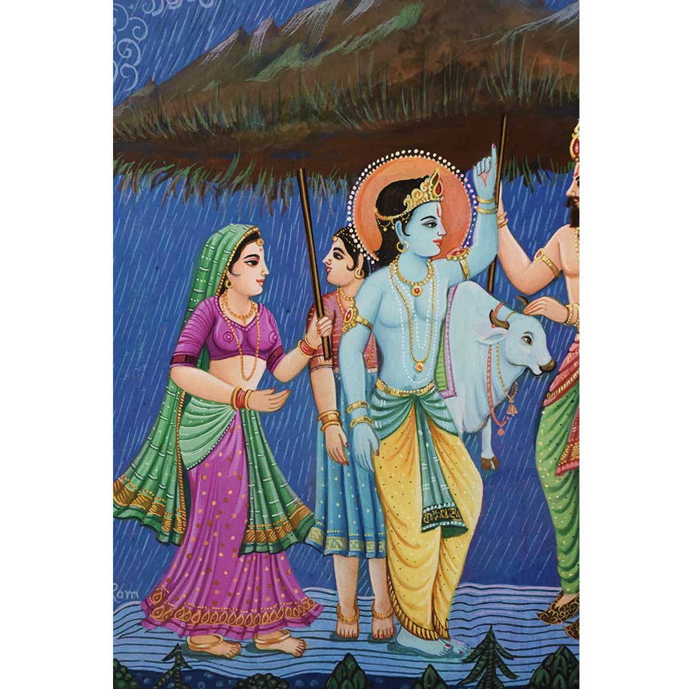 Lord Krishna lifting Govardhan Parvat on his finger to protect the villagers from heavy rains and thunderstorm is shown in this beautiful handmade Calendar Art Painting.