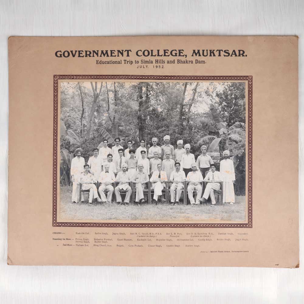 Transport yourself back to a simpler time with this striking vintage photograph from Government College, Muktsar. This black-and-white image captures a youthful exuberance during an educational trip to Simla Hills and Bhakra Dam in July 1952. This remarkable photograph offers a glimpse into the past and immortalizes a special memory for the students pictured. Display it in your home or office as a conversation piece about bygone days. It will stir up nostalgia for the good old days before the chaos of modern life. With its well-dressed subjects and classic styling, this image is perfect for those who appreciate vintage photography. Bring history into your home decor with this must-have for photography buffs, nostalgia seekers, and anyone who wants to be transported back to the 1950s.