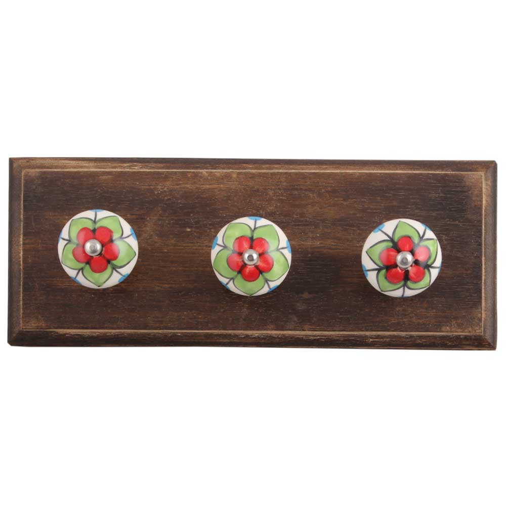 Green Clove Flower Ceramic Wooden Hook. A Perfect Complement to the Soft Tone of the Wood are these White Traditional Hat & Coat Hook Made of Genuine Porcelain and Brass. It can be use to Hang Jewellery, Leashes, Towels, Scarves, Light Weight Sweaters, Caps Etc.
