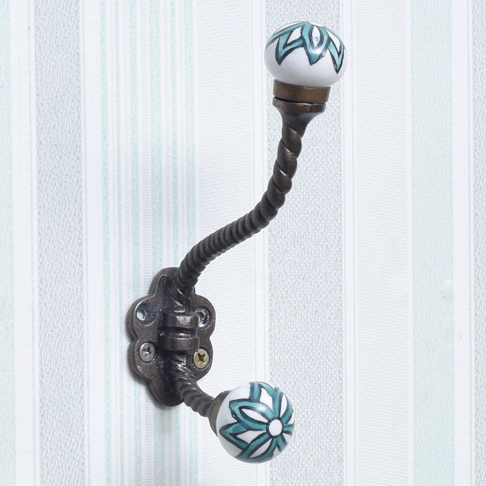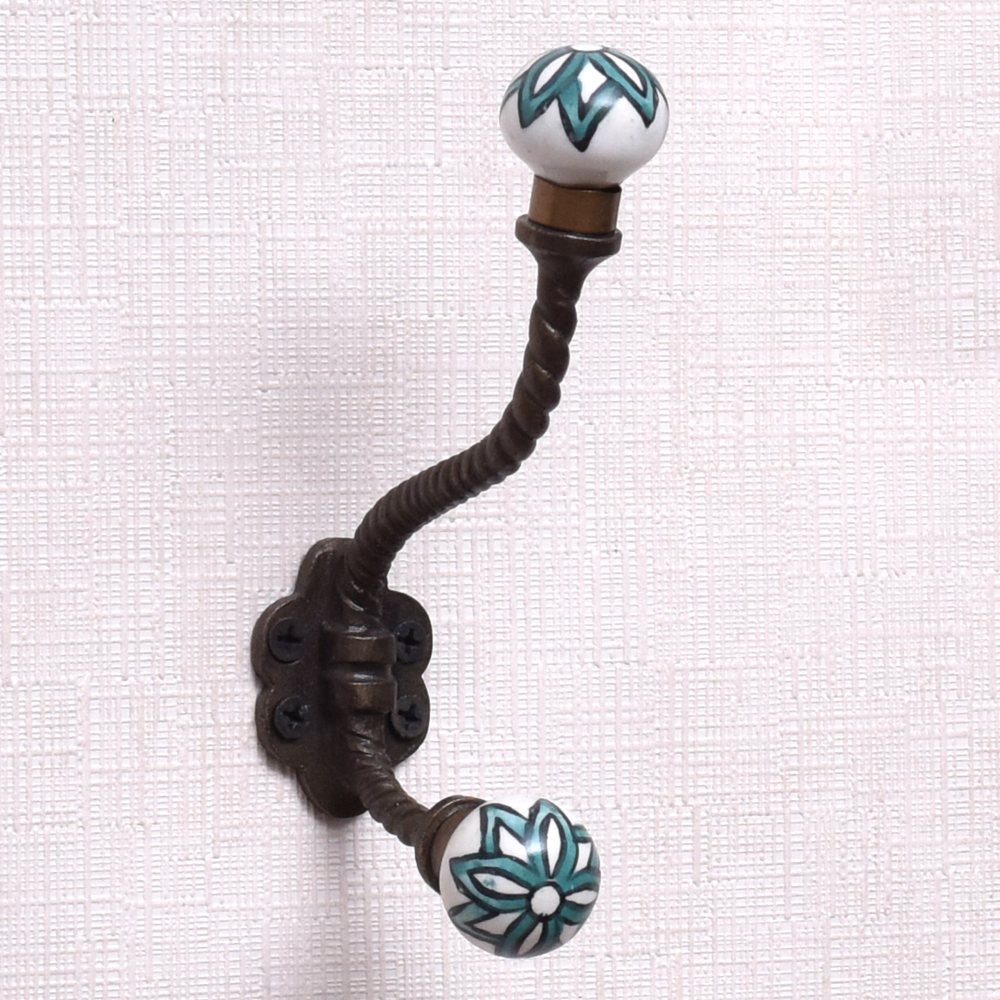 A handcrafted iron wall hook with an elegant black finish, adorned with a ceramic ball engraved with a beautiful blue flower design. This exquisite wall hook is perfect for your bathroom or bedroom, adding a touch of sophistication to your space. The contrast of the black iron and the vibrant blue flower creates a striking visual appeal, making it an attractive and eye-catching piece. Crafted with precision by professional Indian artisans, this wall hook is made to last. The durable iron construction ensures longevity, while the ceramic ball provides a smooth surface for hanging your coats, hats, bags, or other items. The sleek and minimalist design of this coat hooks wall mounted makes it a versatile option for various spaces in your home. Not only is this wall hook functional, but it also makes a thoughtful gift for your near and dear ones on special or festive occasions.
