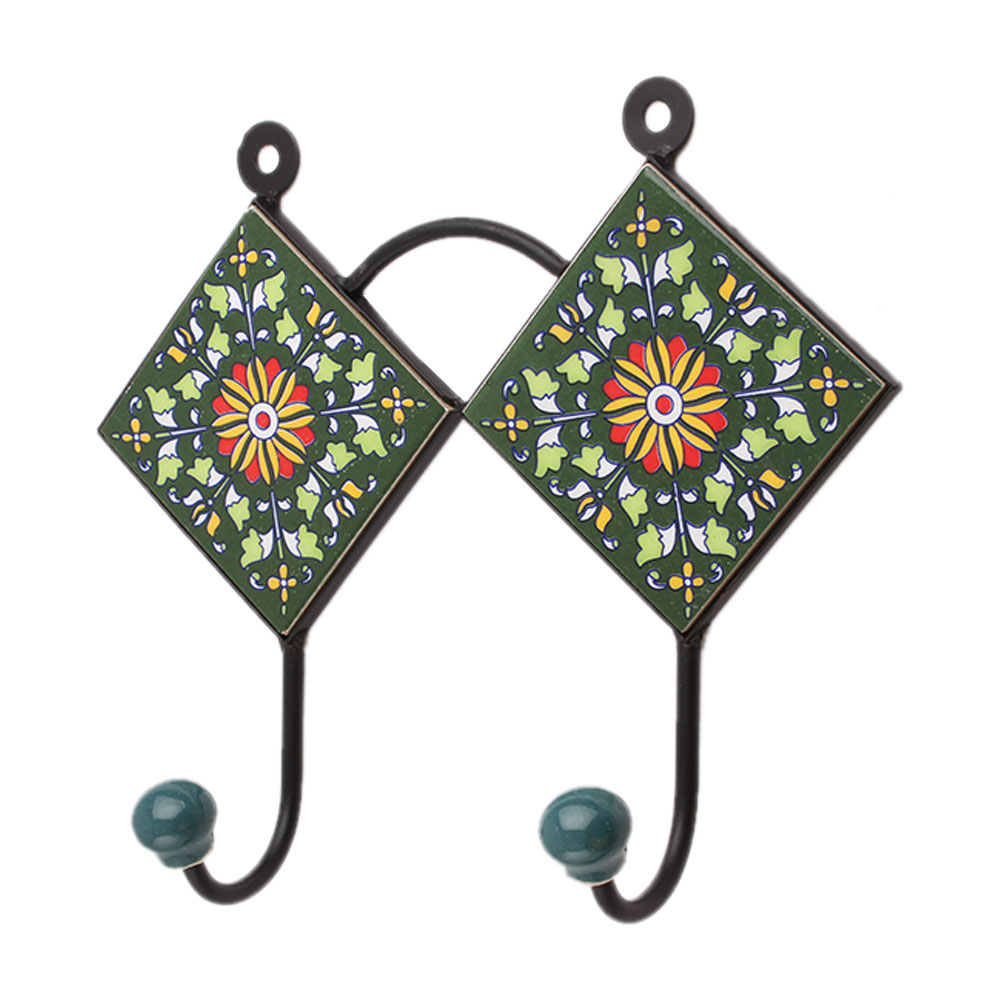 Green Floral Ceramic Tiles Hooks. When put on wall or cabinet it is an art in itself. The metal part of this hook is black powder coated.
