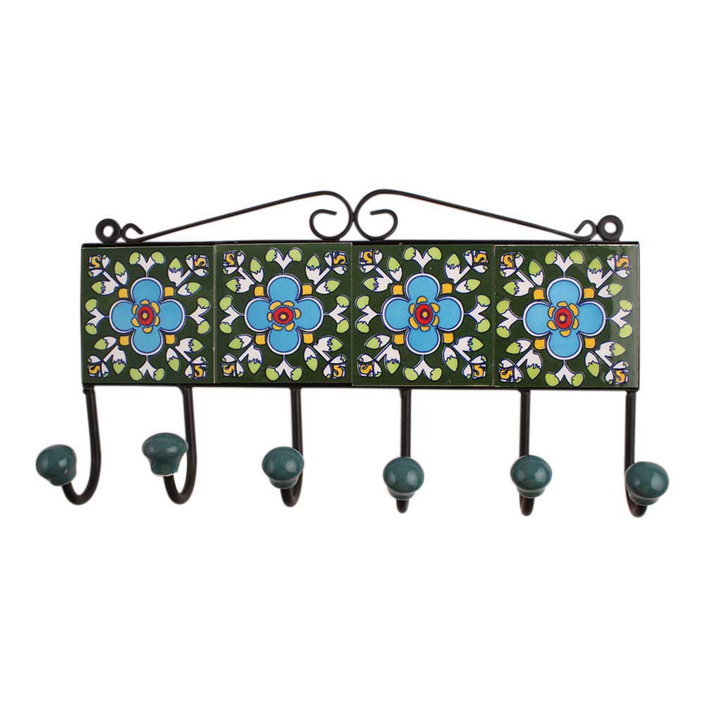 Green Floral Ceramic Tiles Hooks-474 (Set Of Ine Piece)
