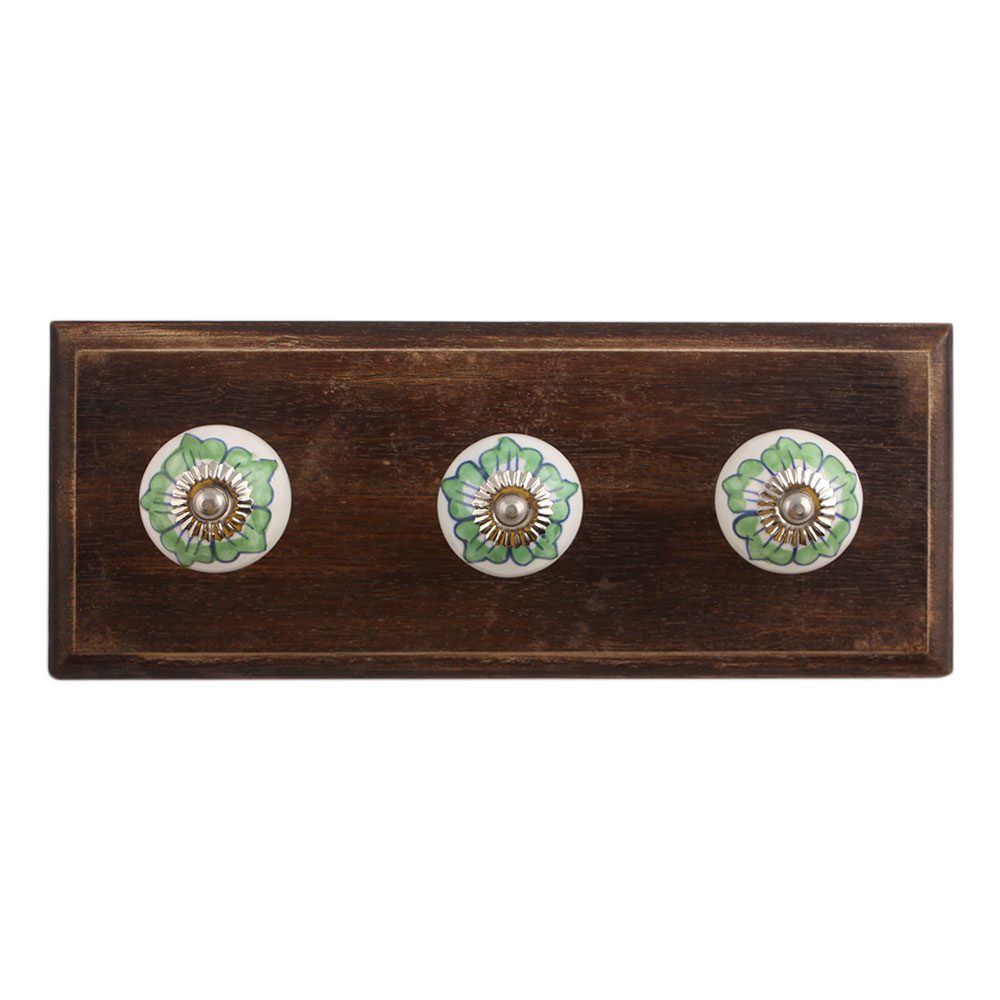 Green Lisianthus Ceramic Wooden Hook. A Perfect Complement to the Soft Tone of the Wood are these White Traditional Hat & Coat Hook Made of Genuine Porcelain and Brass. It can be use to Hang Jewellery, Leashes, Towels, Scarves, Light Weight Sweaters, Caps Etc.