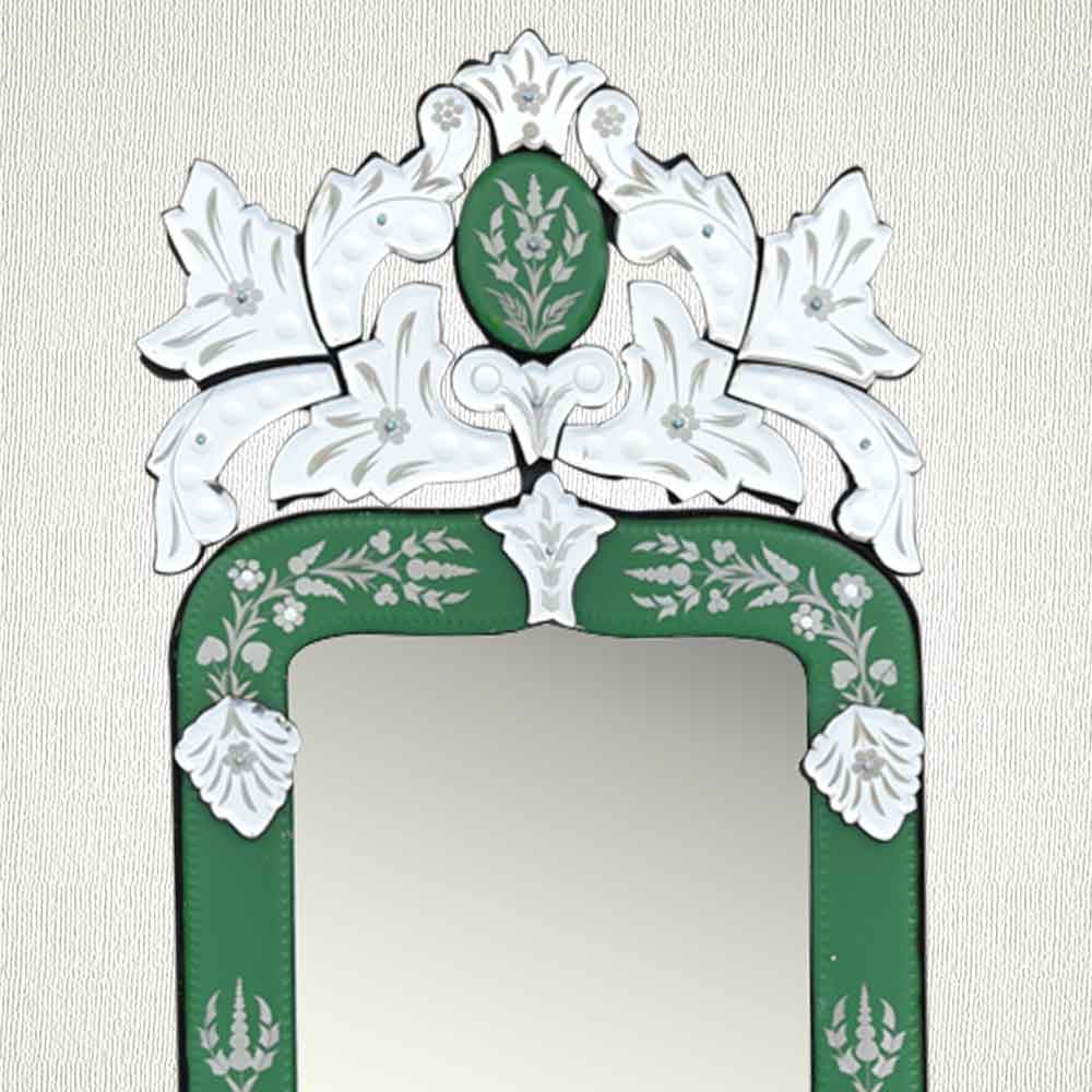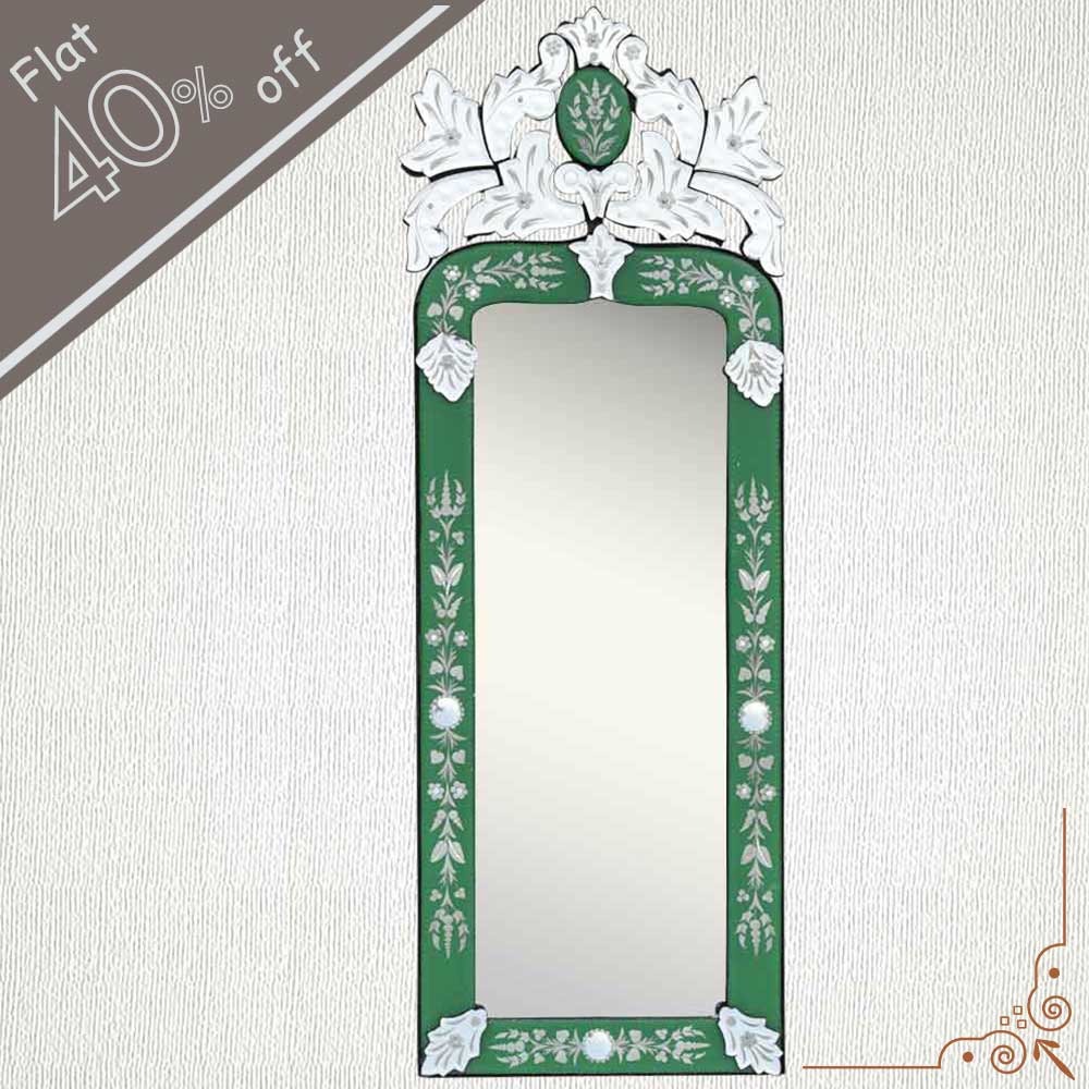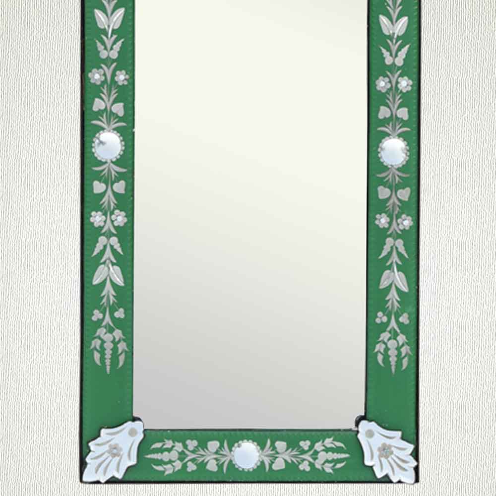 Green Long Venetian Mirror-46.5 inches X 16 inches. A simple way to incorporate an elegant look into any room is the addition of Venetian mirrors these treasured pieces reflect light and serve as an artistic focal point transforming a room into a glamorous environment with a bit of old world elegance.