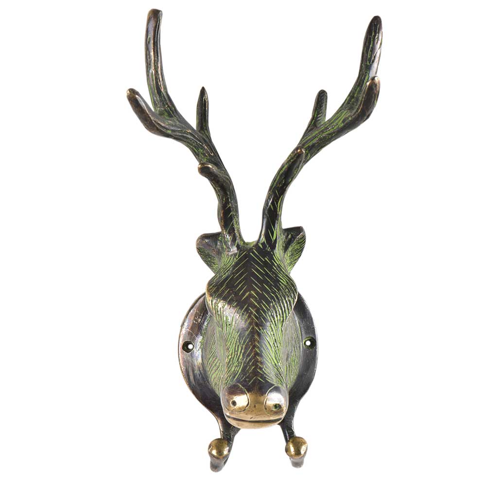 The Green Patina Brass Deer or Elk Head Wall Hook with Antlers and Two Pegs is a striking fusion of handcrafted artistry and practical design. Cast from solid brass and finished in an aged green patina, this detailed wall hook captures the noble presence of a deer or elk head with outstretched antlers. The dual pegs beneath the sculpture offer strong, convenient hanging space, while the rustic patina adds warmth, texture, and timeless appeal. Ideal for those who love nature-inspired décor with real functionality, every piece is slightly unique due to its hand-applied finish.