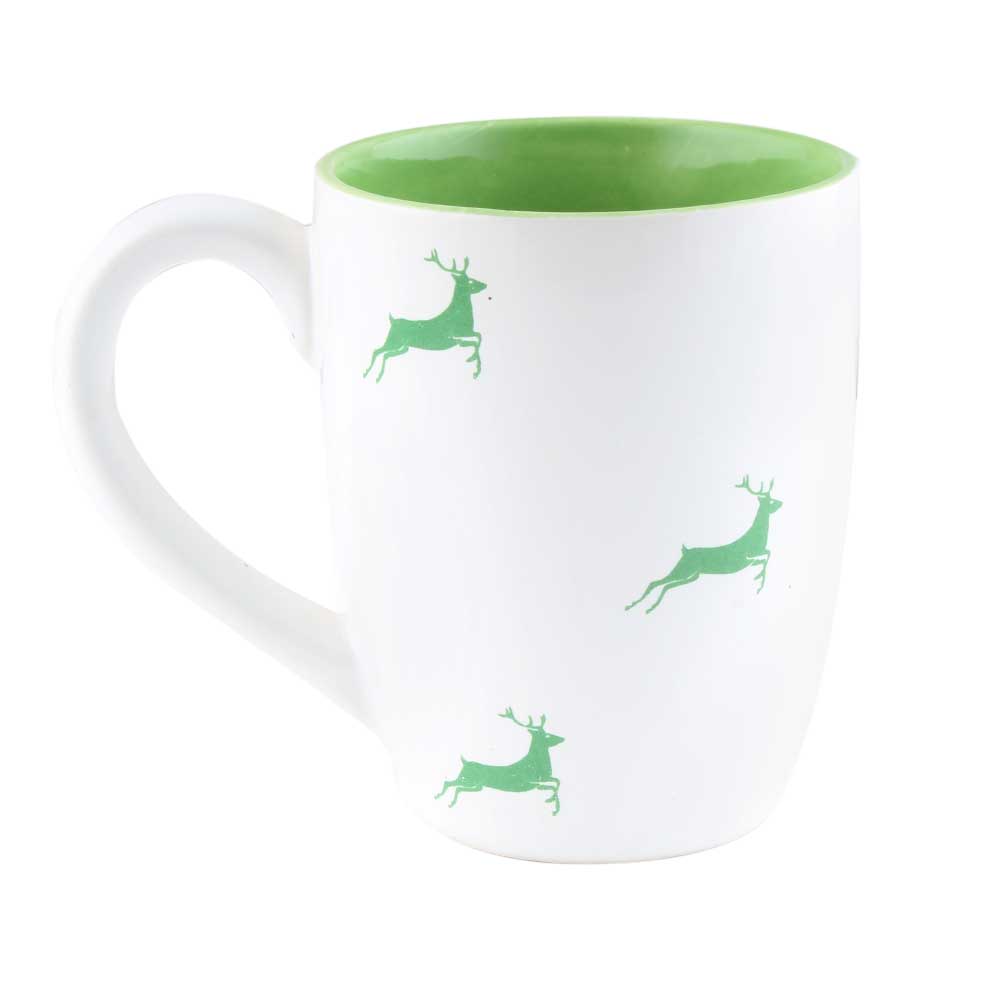 The mug showcases an elegant green running deer motif, capturing the essence of wildlife in motion. The intricate artwork infuses life and charm into this everyday item, making it an excellent addition to your mug collection or a thoughtful gift for nature enthusiasts.