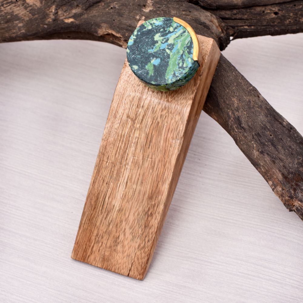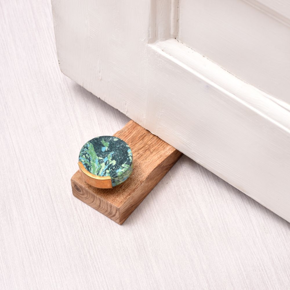 Buy a wooden door stopper online which is a masterpiece crafted with precision by highly skilled and experienced artisans from India. Made from high-quality wood, it boasts an antique brown finish that adds a touch of timeless elegance to any space. Atop this elegant piece rests a mesmerizing blue and green coloured stone, which further enhances its aesthetic appeal. Designed to be both functional and stylish, our door stopper features a rubber grip underneath, ensuring it stays firmly in place, preventing any unwanted slipping or sliding. This practicality makes it an ideal choice for daily use in homes or offices. With its impeccable craftsmanship and attention to detail, our handmade door stopper is not only a practical accessory but also a unique gift option. Perfect for special occasions like housewarmings, it's a thoughtful present that will be cherished by your loved ones. Add a touch of sophistication and utility to your space with this beautiful door stopper.