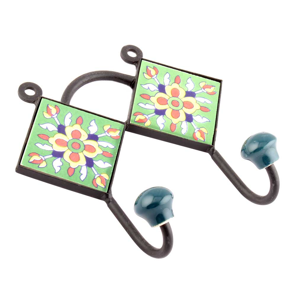 Green Yellow Flower Tiles Hooks. When Put on Wall or Cabinet it is an Art in itself. The Metal Part of this Hook is Black Powder Coated.