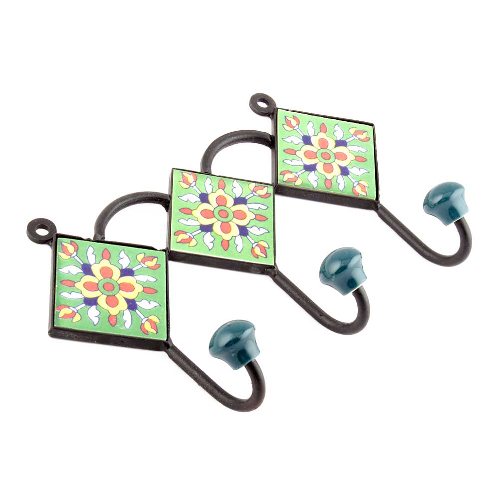 Green Yellow Flower Tiles Hooks. When Put on Wall or Cabinet it is an Art in itself. The Metal Part of this Hook is Black Powder Coated.