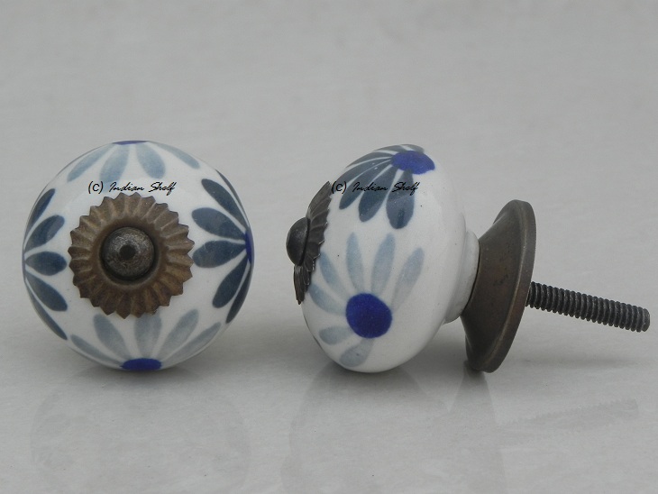 Grey Blue Flower Ceramic Knob. Ideal for kitchen cabinets, kitchen drawers, dining room, bed room, chest drawers, dressing tables, almirah