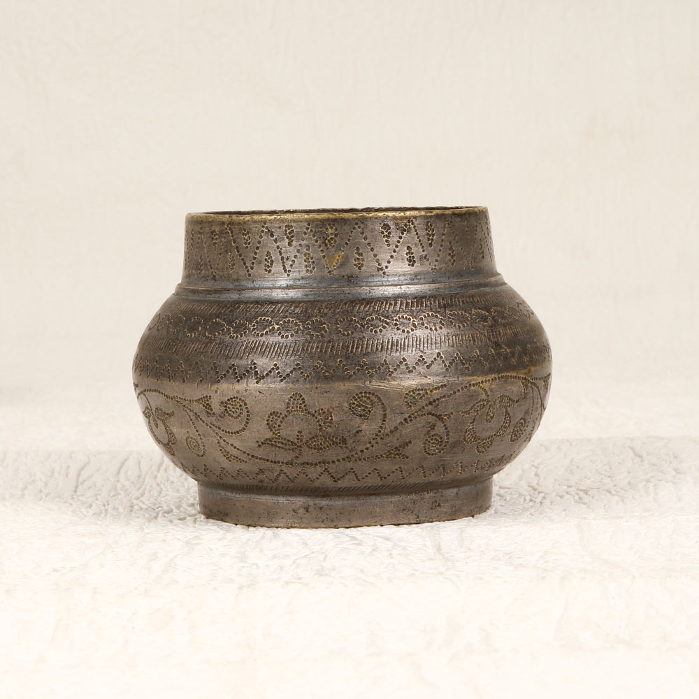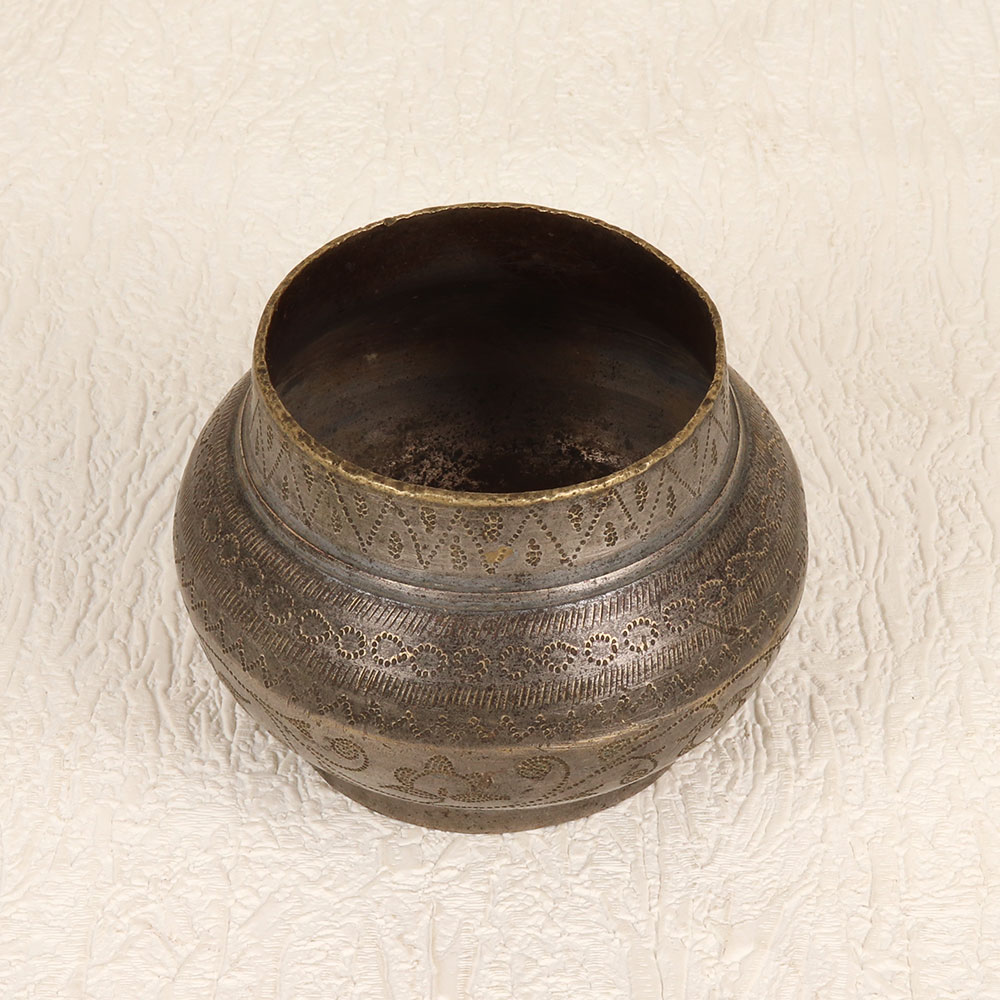 A Vintage Brass Holy Water Pot that is a testament to the artistry of highly skilled Indian artisans. Handcrafted from high-quality brass, this sacred vessel boasts intricate needle engravings, adding a touch of timeless elegance to your prayer, rituals, and havans. The antique grey finish enhances its vintage allure, making it a captivating addition to any home, office, restaurant, hotel, or café prayer room. This meticulously crafted holy water pot serves as a symbol of devotion, blending functionality with aesthetic appeal. Its versatility extends beyond religious practices, as it doubles as a charming decor piece that effortlessly complements various settings. Embrace its historical charm by incorporating it into your vintage collection, creating a curated display that reflects both spirituality and artistry. Share the blessings by presenting this handmade masterpiece to your family, friends or relatives on special, festive, or auspicious occasions. Whether as a thoughtful gift or a cherished addition to your personal sanctuary, this Vintage Brass Holy Water Pot is a timeless embodiment of craftsmanship and devotion.