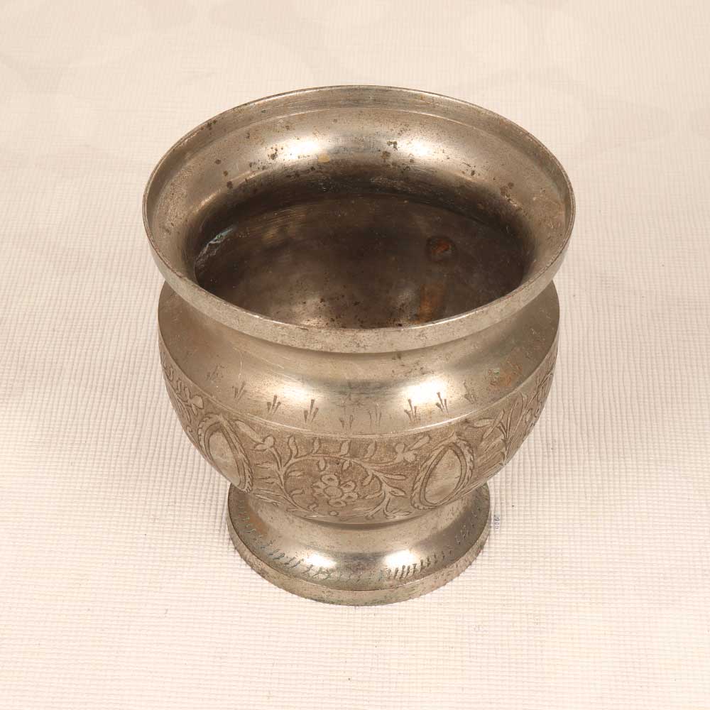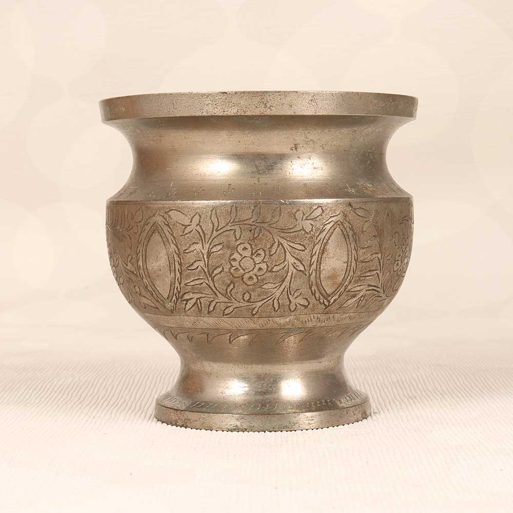 Display your favorite blooms in chic, vintage style with this engraved brass flower pot. Cast from solid brass, this pot features a patinated grey finish that accentuates the delicate floral engravings in classic English Arts and Crafts style. With its ornate detailing and vintage patina finish, this brass flower pot brings a refined touch of old-world character to any space. The soft grey finish allows the engraved floral designs to really stand out, creating a pot that's as beautiful on its own as it is filled with flowers. Place it on your dining table or bookshelf to add a subtle artistic element. For windowsills and side tables, fill it with fresh blooms or faux greenery to complement the vintage style. Let this engraved brass pot bring a breath of aged charm to your home decor.