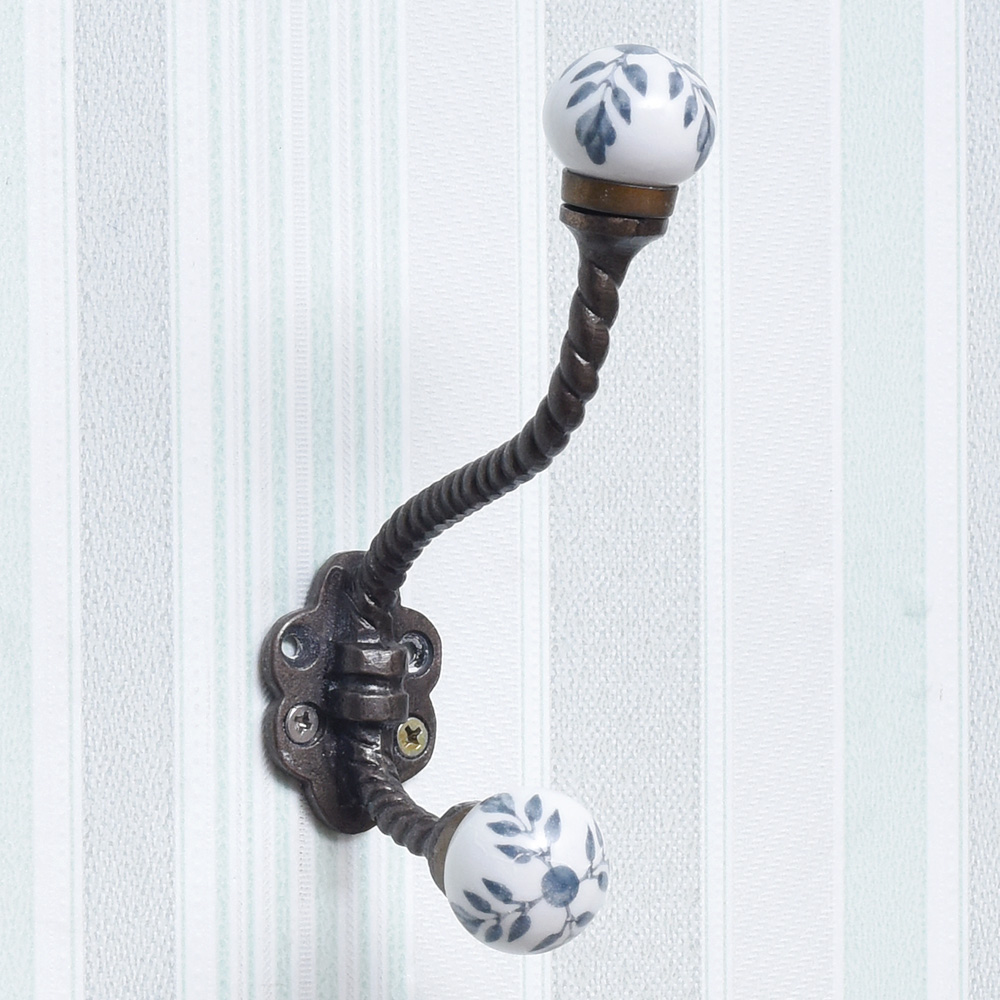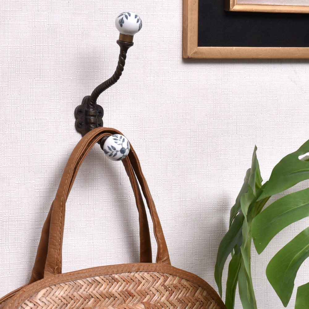Add a touch of elegance to your home with this exquisite wall hook crafted from iron and ceramic in a dark finish. Adorned with beautiful blue leaf engravings, this wall hook is not only functional but also a piece of art. Handmade by highly skilled and experienced Indian artisans, this wall hook showcases exceptional craftsmanship and attention to detail. With its versatile design, this wall hook is perfect for hanging a variety of items, such as clothes, coats, hats, belts, or hand towels, making it a practical addition to any room in your home. The sturdy iron construction ensures durability, while the smooth ceramic surface provides a gentle and stylish place to hang your belongings. This wall hook also makes a thoughtful gift for your loved ones on special or festive occasions. Whether it's for a housewarming, birthday, or any other celebration, this black coat hook walls mounted, purse wall hanger, or clothes hook for wall is sure to impress with its unique design and quality.
