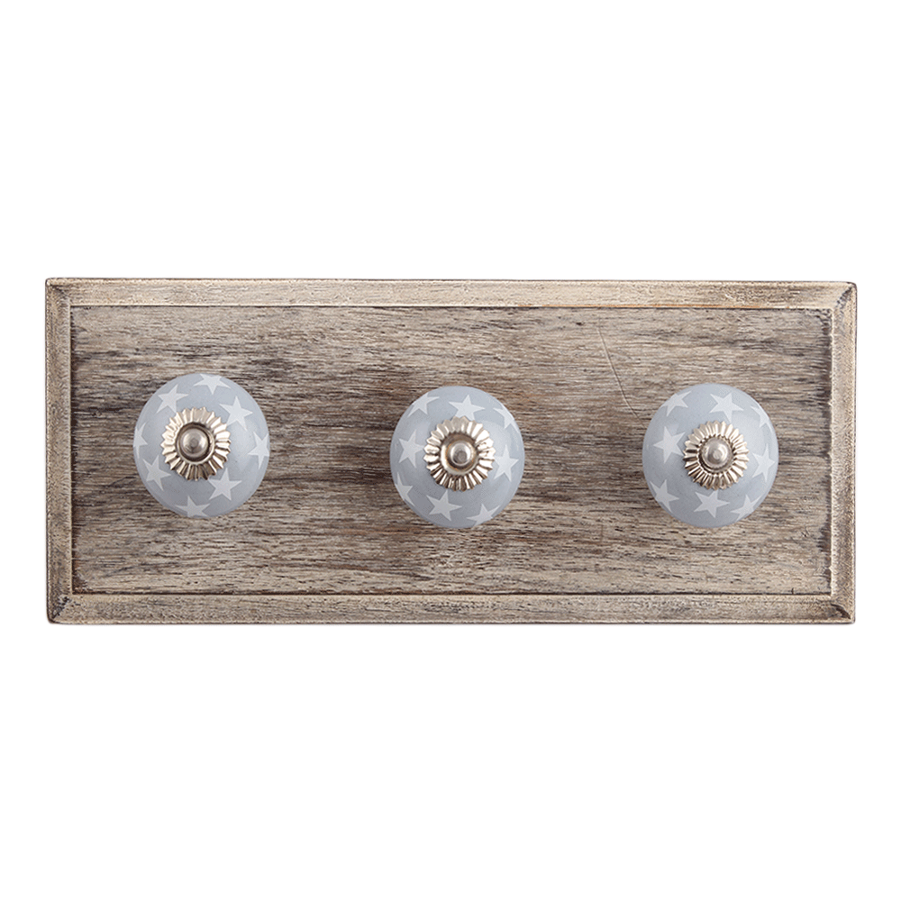 Grey Star Ceramic Wooden Hook. A Perfect Complement to the Soft Tone of the Wood are these White Traditional Hat & Coat Hook Made of Genuine Porcelain and Brass. It can be use to Hang Jewellery, Leashes, Towels, Scarves, Light Weight Sweaters, Caps Etc.