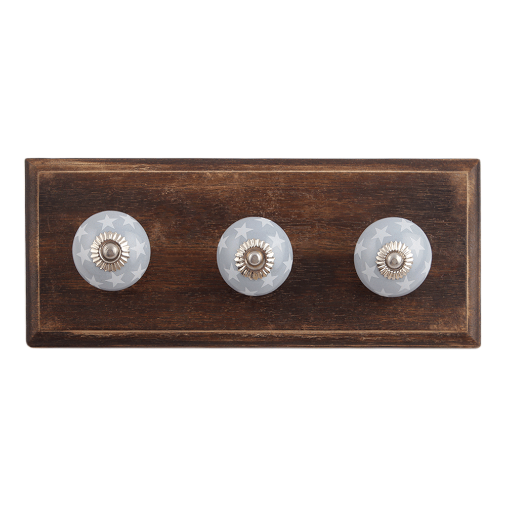 Grey Star Ceramic Wooden Hook. A Perfect Complement to the Soft Tone of the Wood are these White Traditional Hat & Coat Hook Made of Genuine Porcelain and Brass. It can be use to Hang Jewellery, Leashes, Towels, Scarves, Light Weight Sweaters, Caps Etc.