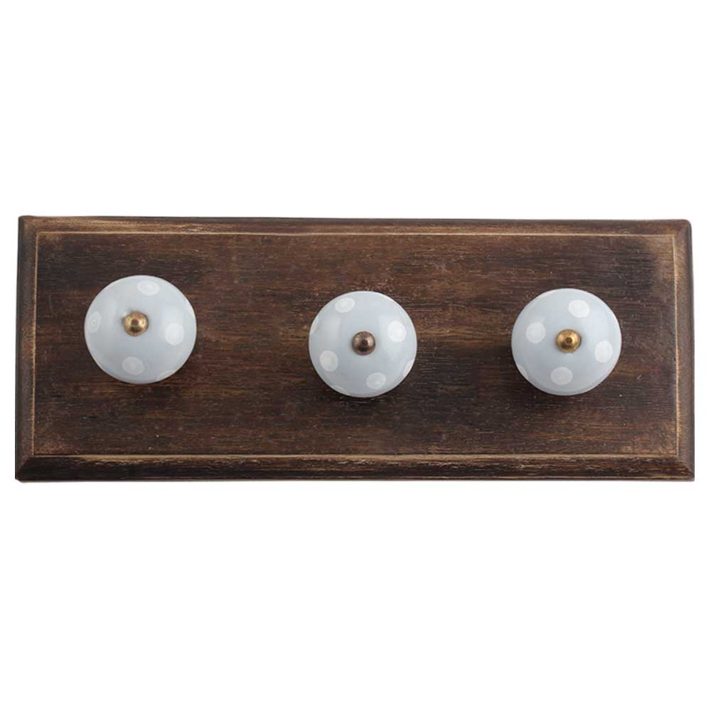 Grey White Dot Wooden Hooks . A Perfect Complement to the Soft Tone of the Wood are these White Traditional Hat &Amp; Coat Hook Made of Genuine Porcelain and Brass. It can be use to Hang Jewellery, Leashes, Towels, Scarves, Light Weight Sweaters, Caps Etc.