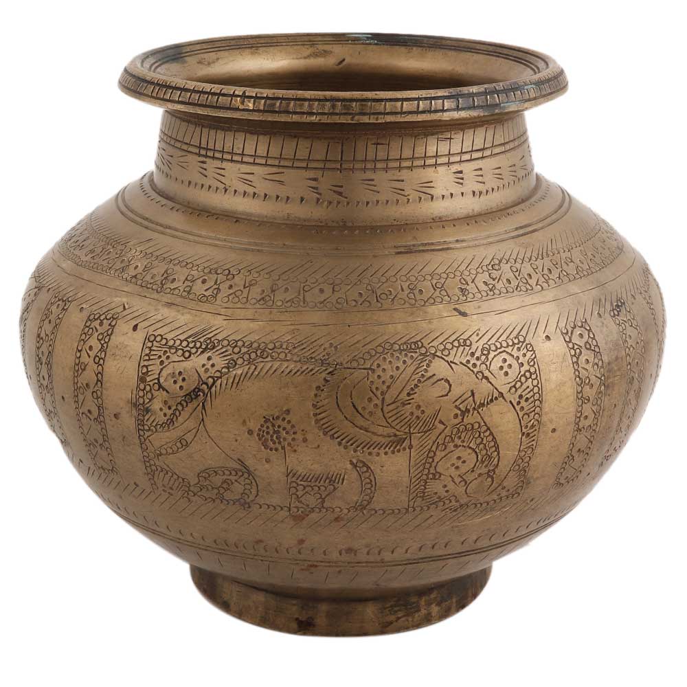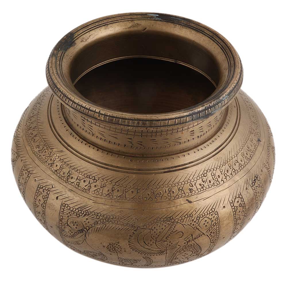 This intensely engraved round water pot with animal figures and floral designs all over. Use it as a flower pot, decoration for your home, mandir or temple, wedding, anniversary, and house warming gift