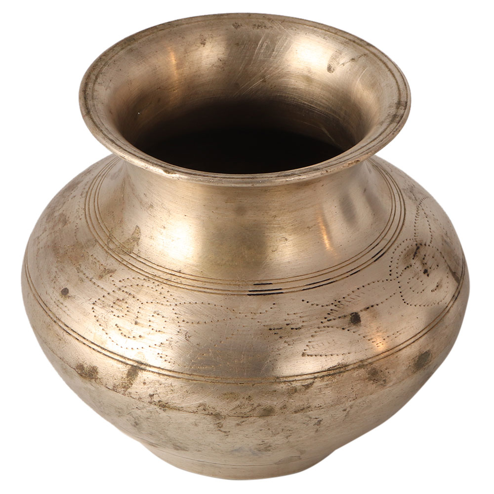 This traditionally hand-carved lota or water vessel is made of white metal alloy with intricate details. It has been engraved with a needle with the face of a rabbit. It has a flat bottom. Due to its charming appearance, you can use it as a decoration at home, office, restaurant, hotel or stage. It can also be used as a flower pot.