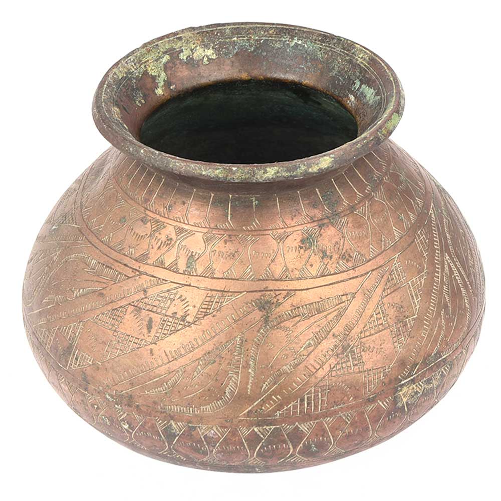 Old Flower Carved Brass Water Pot Vintage Shape Ganga Jal Kalash Lota.