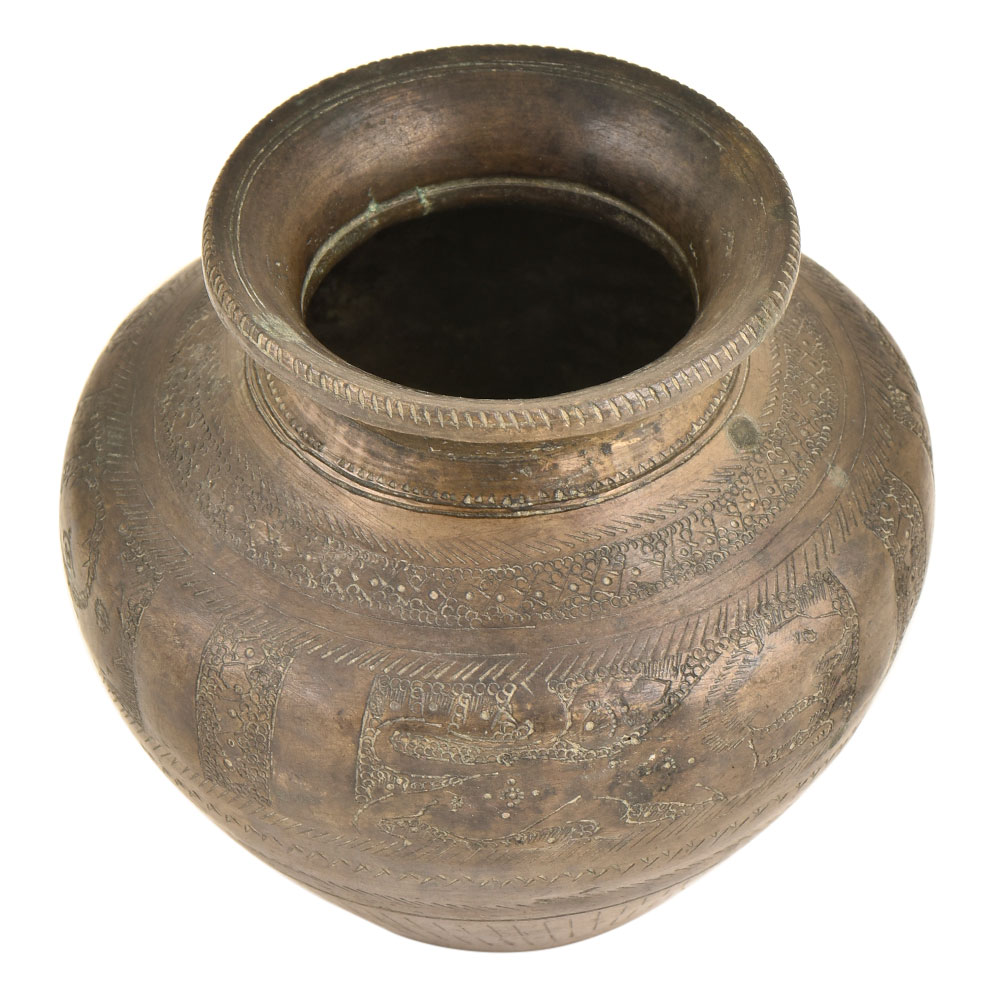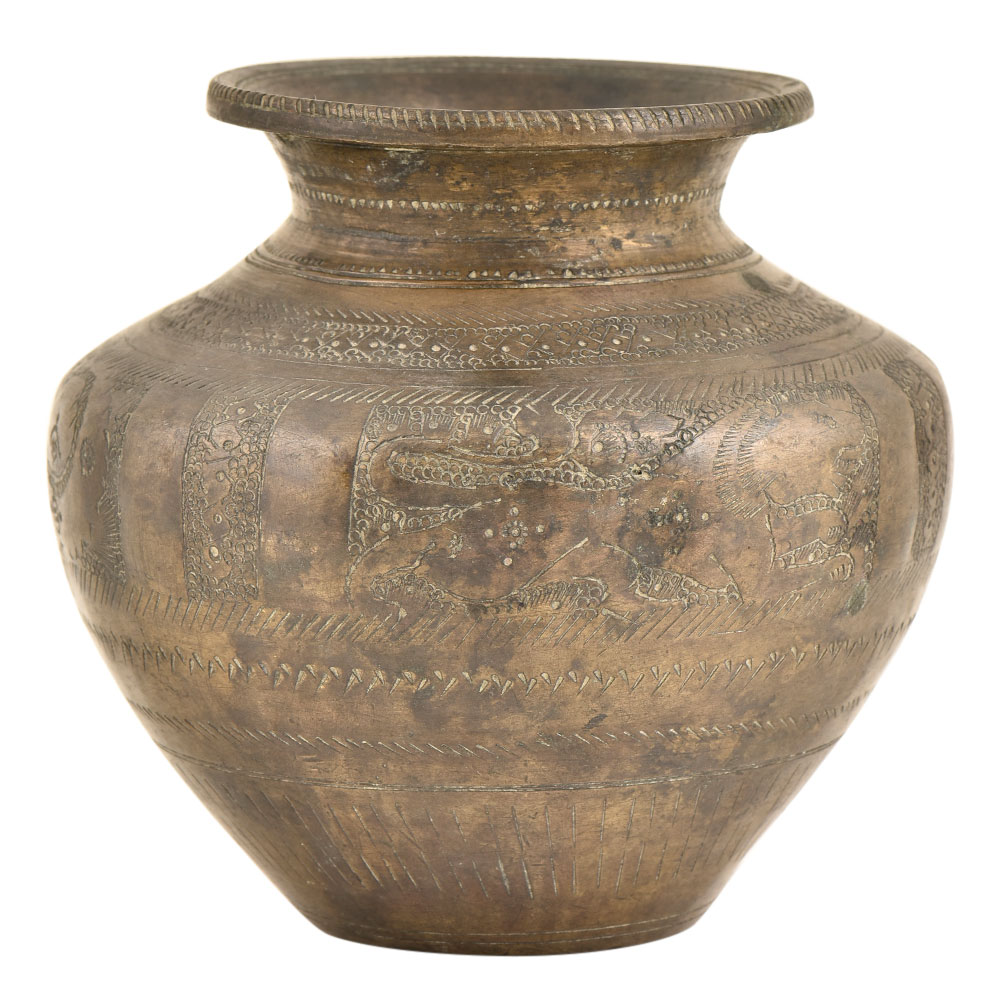 Traditional water pot Indian hand engraved design nice Indian culture. Lota ceremonial water pot was originally carried by Hindus for ablution purposes. Nice animal figures chapel worship utility animal figurative designed flower engraved design by the expert craftsmen of India.