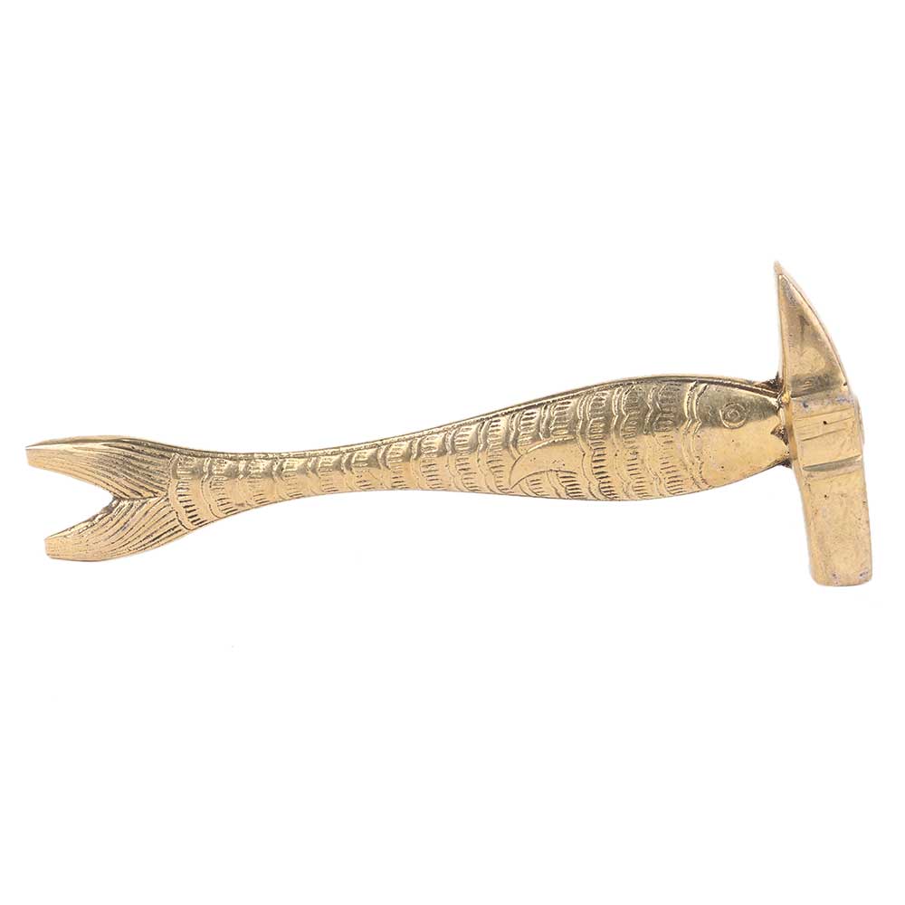 Hand crafted brass carved fish with hammer design on top for table decoration, home decoration , Study table decoration , house warming gift, diwali gift . The paper weight is heavy and serves its purpose with fine detailing and lovely golden color.
