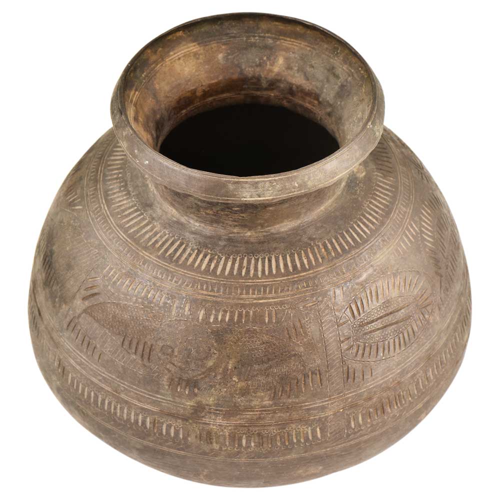 This Handmade Water Pot has Unique Carvings and Engravings Covering Its Surfaces Along with Beautiful Flowing Floral Patterns. The Brass is oxidized, making a stark relief to the bright carvings of the brass Itself. Used to Store Water at a Cooler Temperature. It Rests Calmly on the Rounded Base, and Can Be Easily Lifted by the Tufted Neck. The Carvings Extend Over the Lip of the Edge of the Pot and Into the Inner Surfaces as Well. This Piece Would Make a Wonderful Topper to An Accent or Corner Table in a Room, and the Subtle Colors Make It the Perfect Accompaniment to Any Room's Decor.