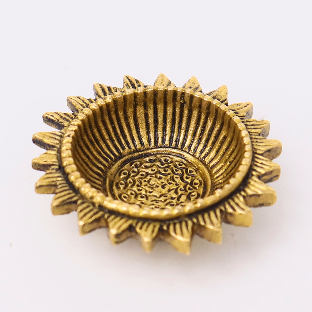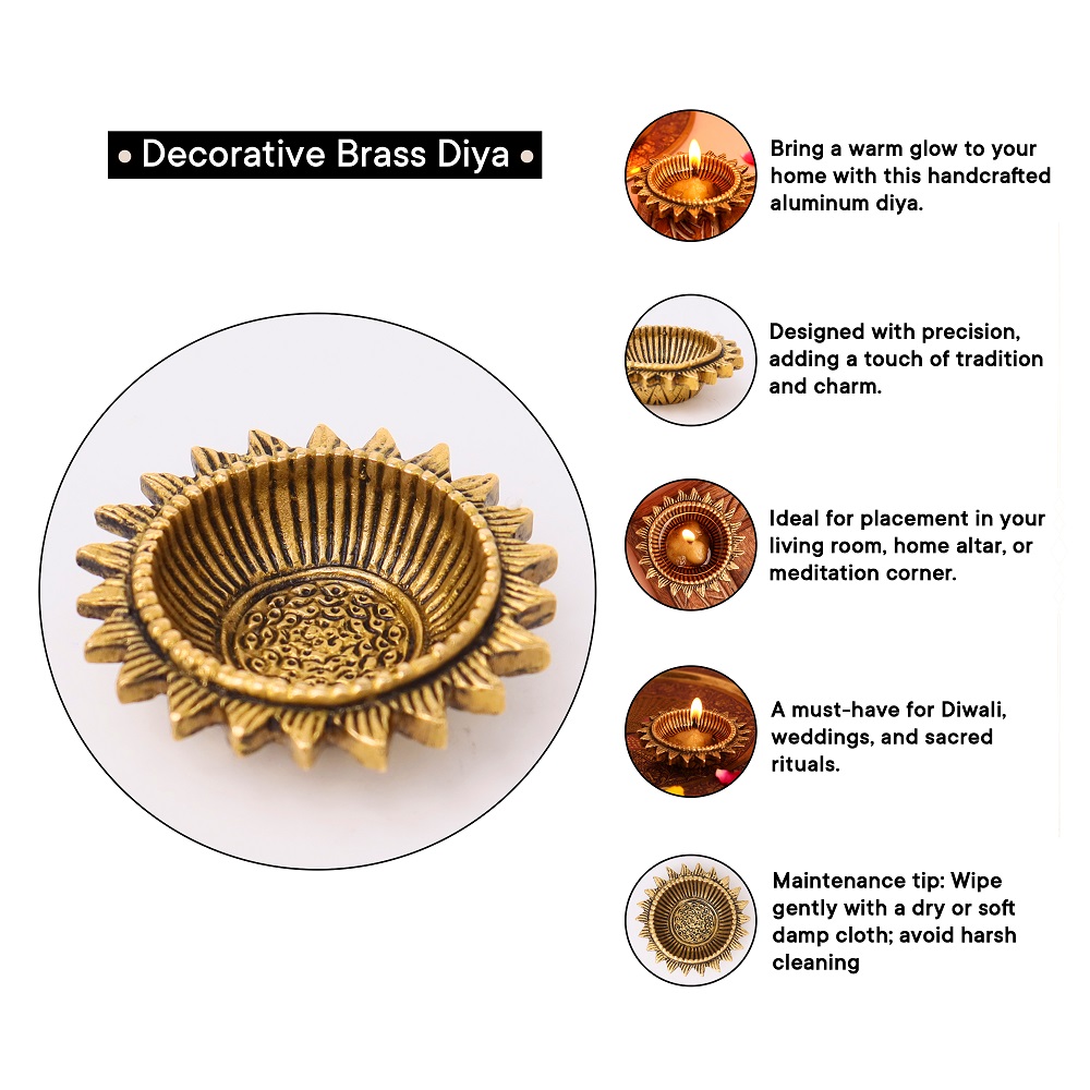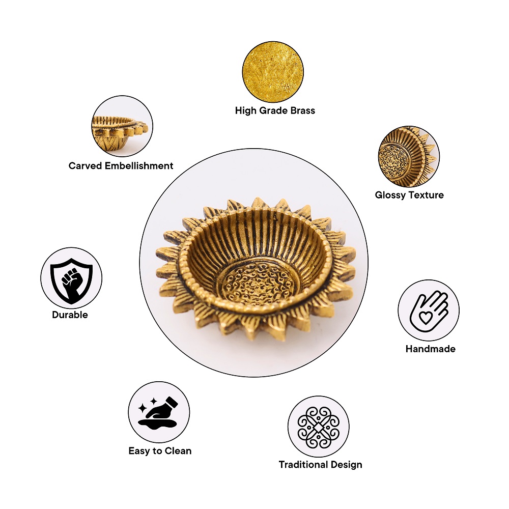 Bring the brilliance of tradition into your home with the Handcrafted Sunflower Brass Oil Lamp, a diya inspired by the radiance of the sun. The sunflower motif symbolizes positivity, devotion, and divine energy, while the golden brass finish adds warmth and charm. Compact yet eye-catching, it’s ideal for puja rituals, rangoli arrangements, and festive lighting.