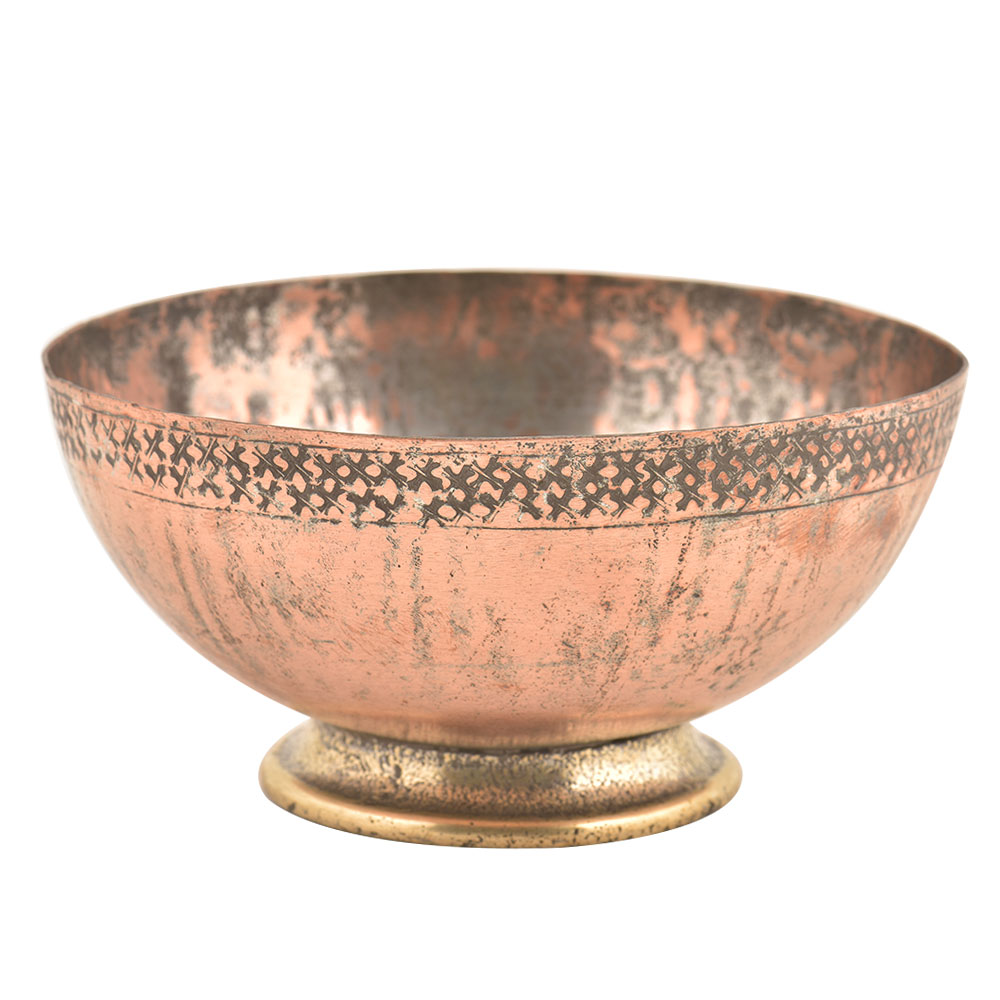 The hand made Copper Bowl is a Beautifully Unique Piece Complete with a Hammered cross Pattern Design. The Perfect Addition to Any Set or Your Home Kitchen Decor. It has geometrical patterns to the side and base and a rolled over top rim of the bowl. The perfect addition to any set or your home kitchen decor.