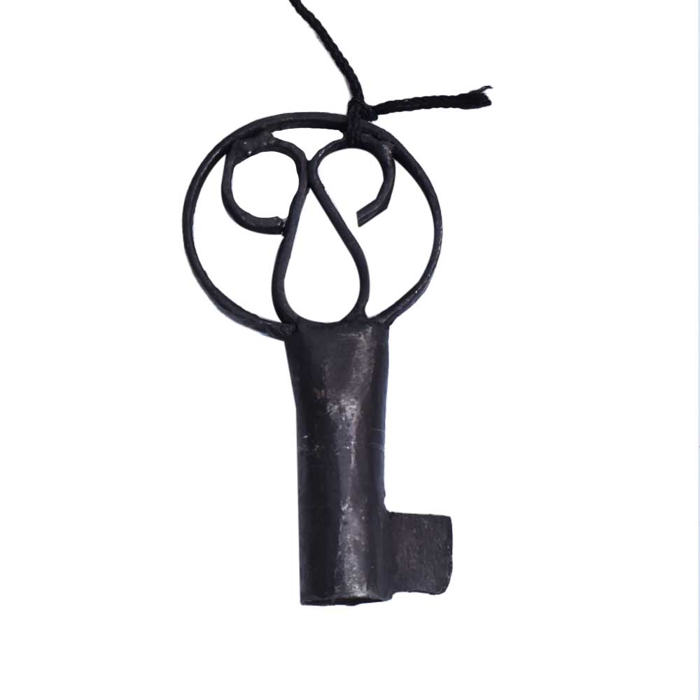 Set of a cast-iron lock and key. Key fits in the on one side located keyhole. However, because it is not intended to be an actual lock, the lock will not work when pulled on. Cast iron is used to create a rustic, vintage look.