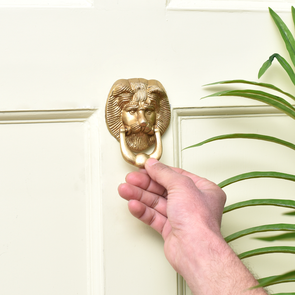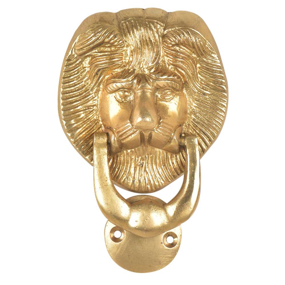Bring the inviting warmth of nature to your front door with the addition of the lion Head door knocker. Made of solid brass, this door knocker includes matching mounting hardware and striking plate. A Lion door knockers is an ideal decorative accent for a front entryway and is a great way for stylishly announcing a visitor.