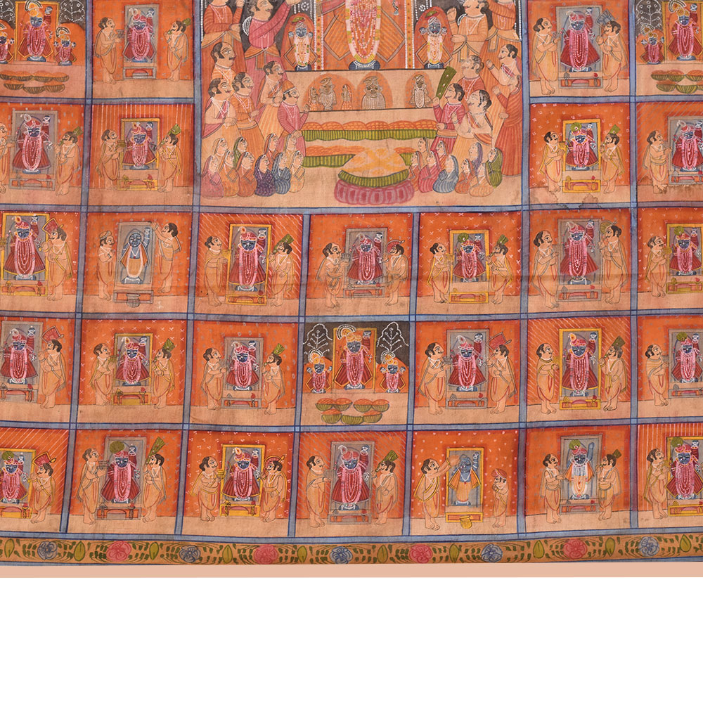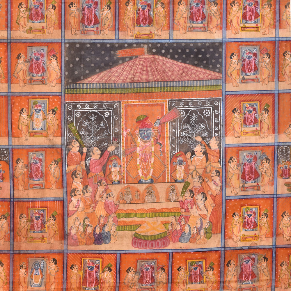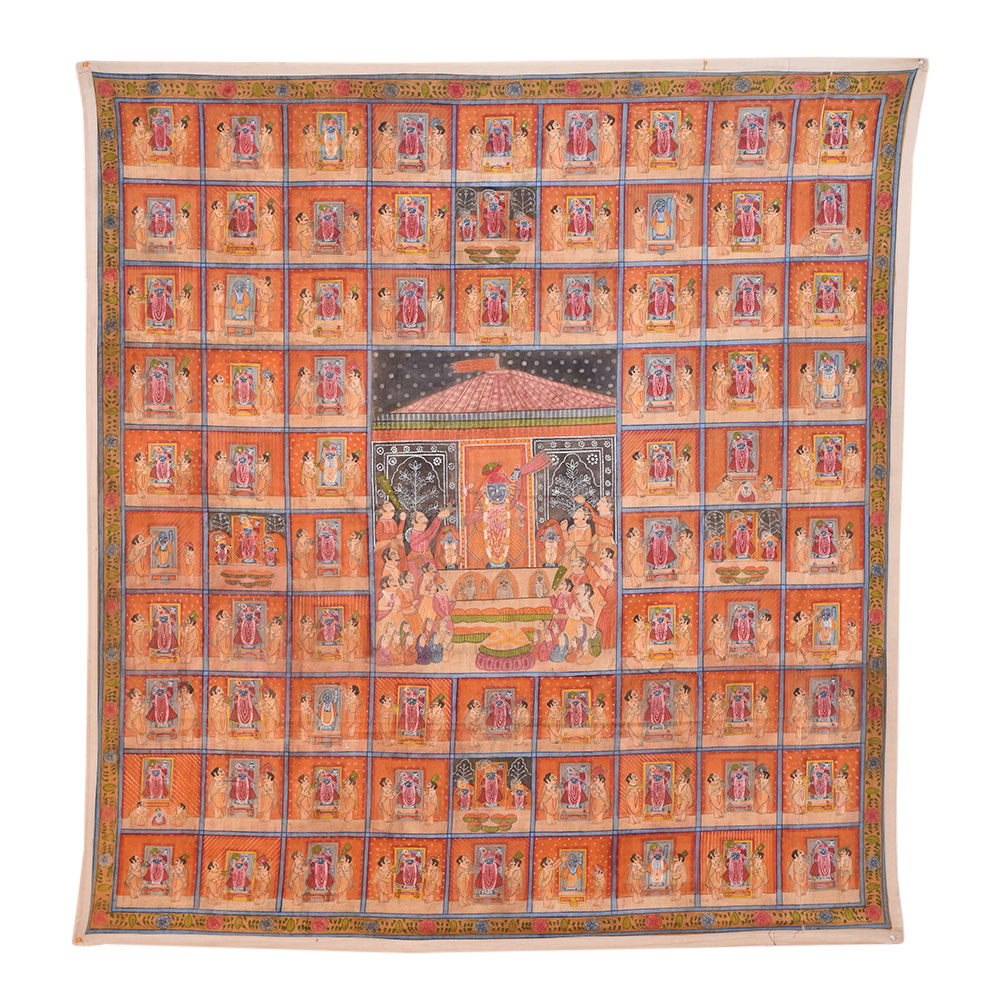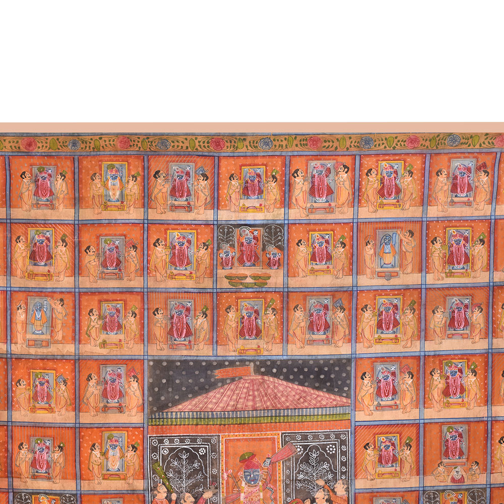 A pichwai painting on fabric cloth is a traditional form of Indian art that originated in the town of Nathdwara in Rajasthan. This form of art is typically used to decorate the walls of Hindu temples and is known for its intricate detailing and vibrant colours. The particular pichwai painting being described depicts a stunning scenery of a Hindu temple in the centre of the painting, surrounded by 78 smaller sceneries of various Hindu god temples. Each of these smaller sceneries depicts two devotees paying their respects to the gods, adding a personal touch to the painting. The painting has been carefully crafted by professional Indian artists who have paid meticulous attention to detail. The use of multi-coloured hues creates a mesmerizing effect that is sure to captivate anyone who sets eyes on it. The painting is an auspicious addition to any prayer room or temple and is sure to add a touch of divinity to the surroundings. It also makes for a wonderful gift for family, friends, or relatives on special or festive occasions, symbolizing good luck, prosperity, and divine blessings.