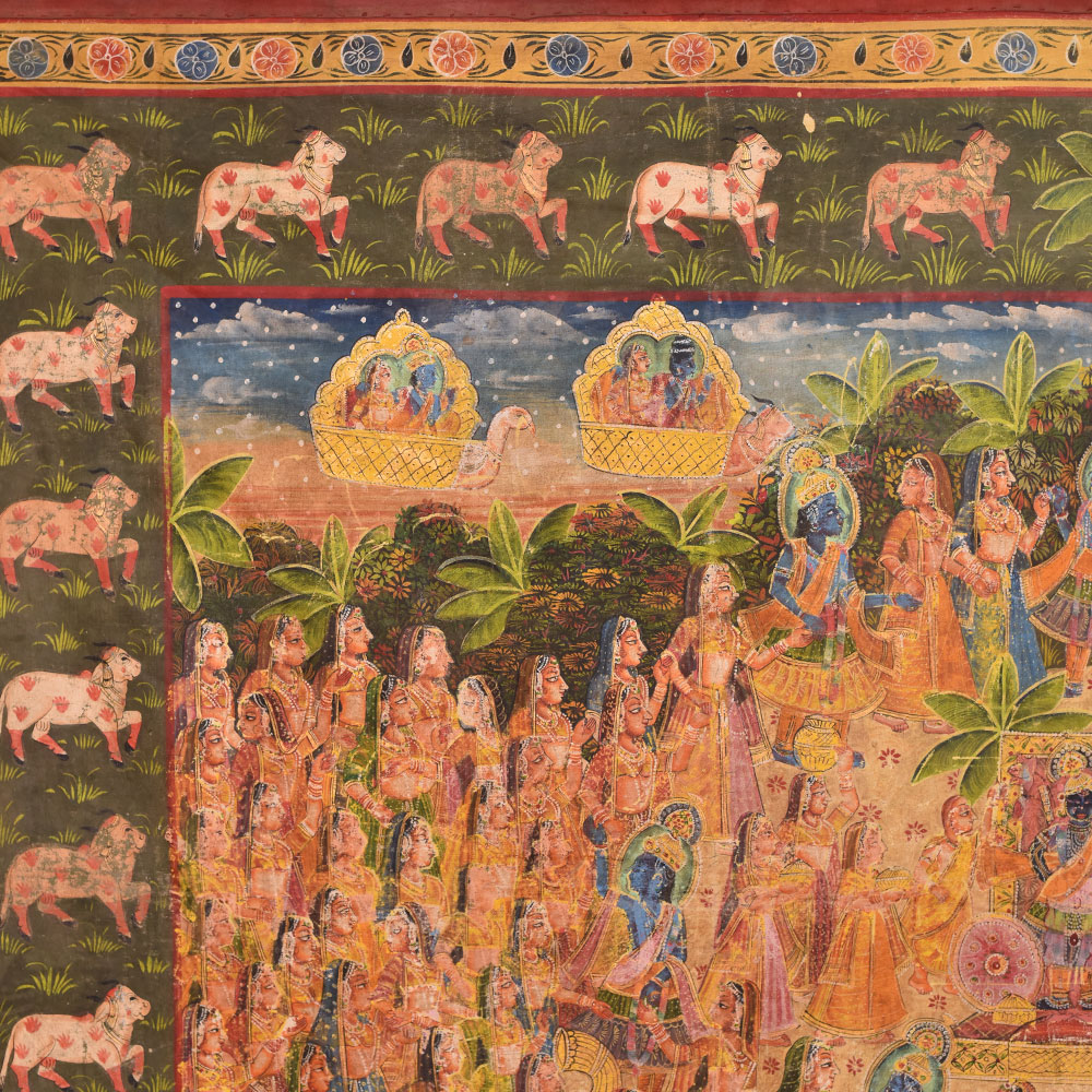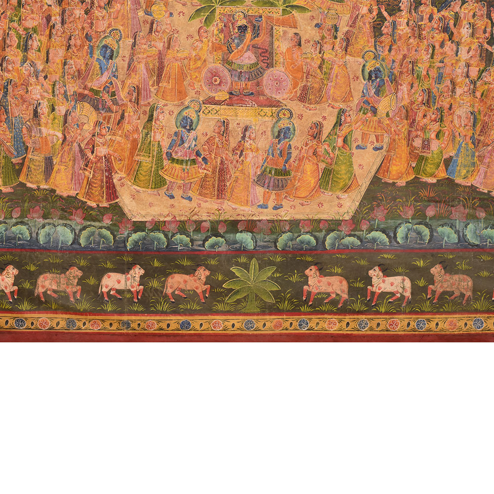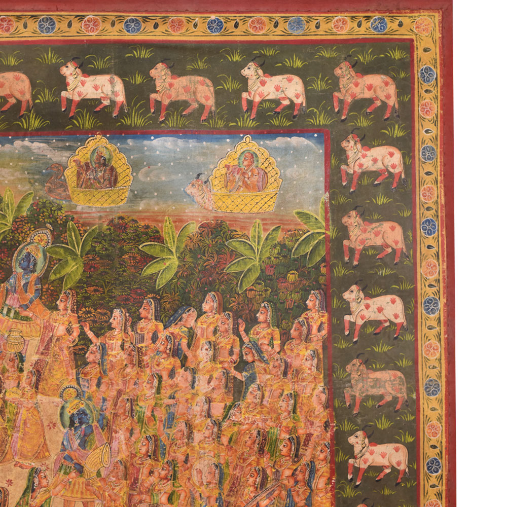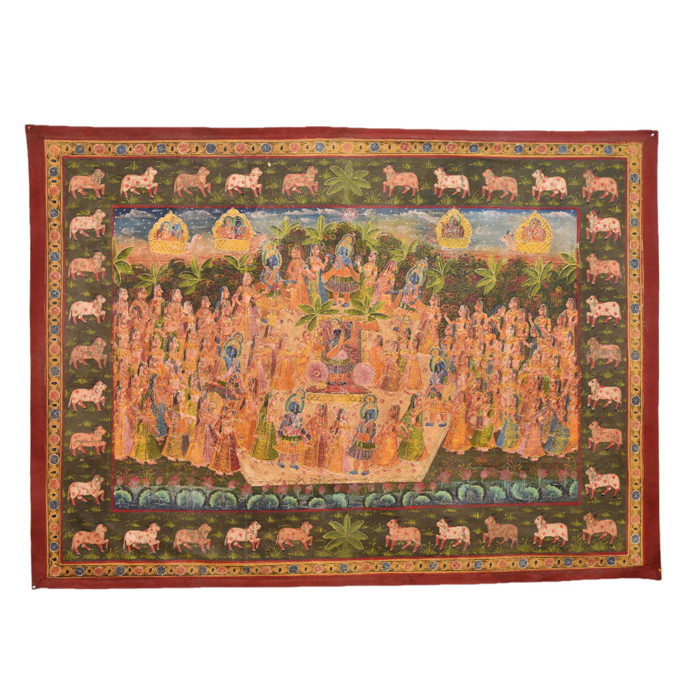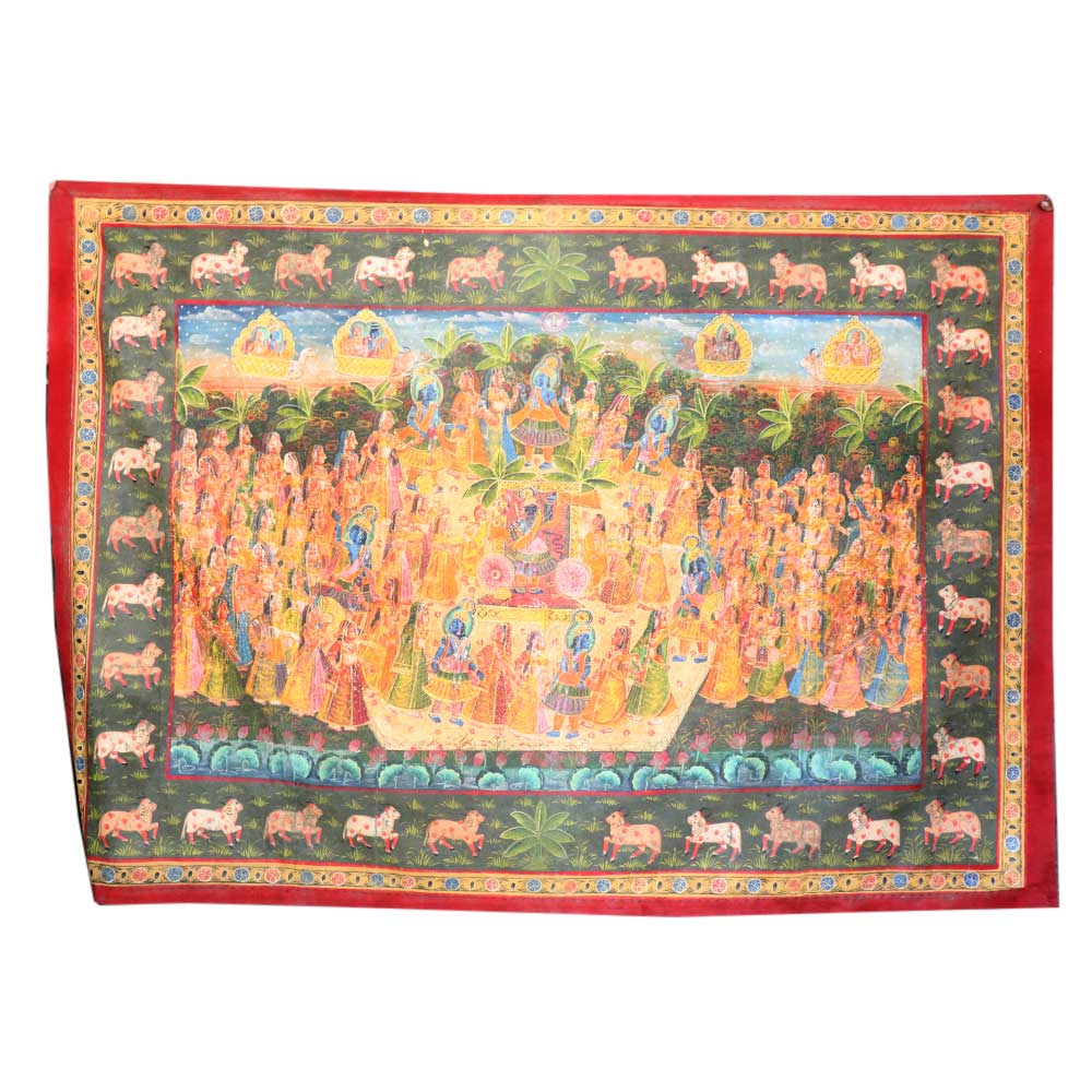 This ancient Pichwai Painting showing Maha Ras performed by Lord Krishna. This is actually a devotional dance of ShrinathJi with gopis as performed on sharad poornima or full moon day. The border shows many Kamdhenu cows painted in the entire Frame, Pichwai paintings are perfect for Home , hotel, office and shop decoration. Diwali gift, wedding gift and new year gift for your near and dear ones.