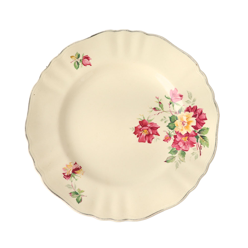 The ideal porcelain dishes feature lovely pink and red roses with a matte-glazed finish in a traditional mid-century design. They are extremely useful and sturdy, and they would look fantastic on your table. The plate's foundation is milk white, and a design of roses in pink, red, and blue hues has been hand painted on it. Beautiful antique French earthenware dishes to add to a collection or use as decor are ideal for your vintage French-style table setting. The porcelain dish is a highly decorative item; show it in your cabinet or closet, use it as centerpieces, or use it to decorate a wall.