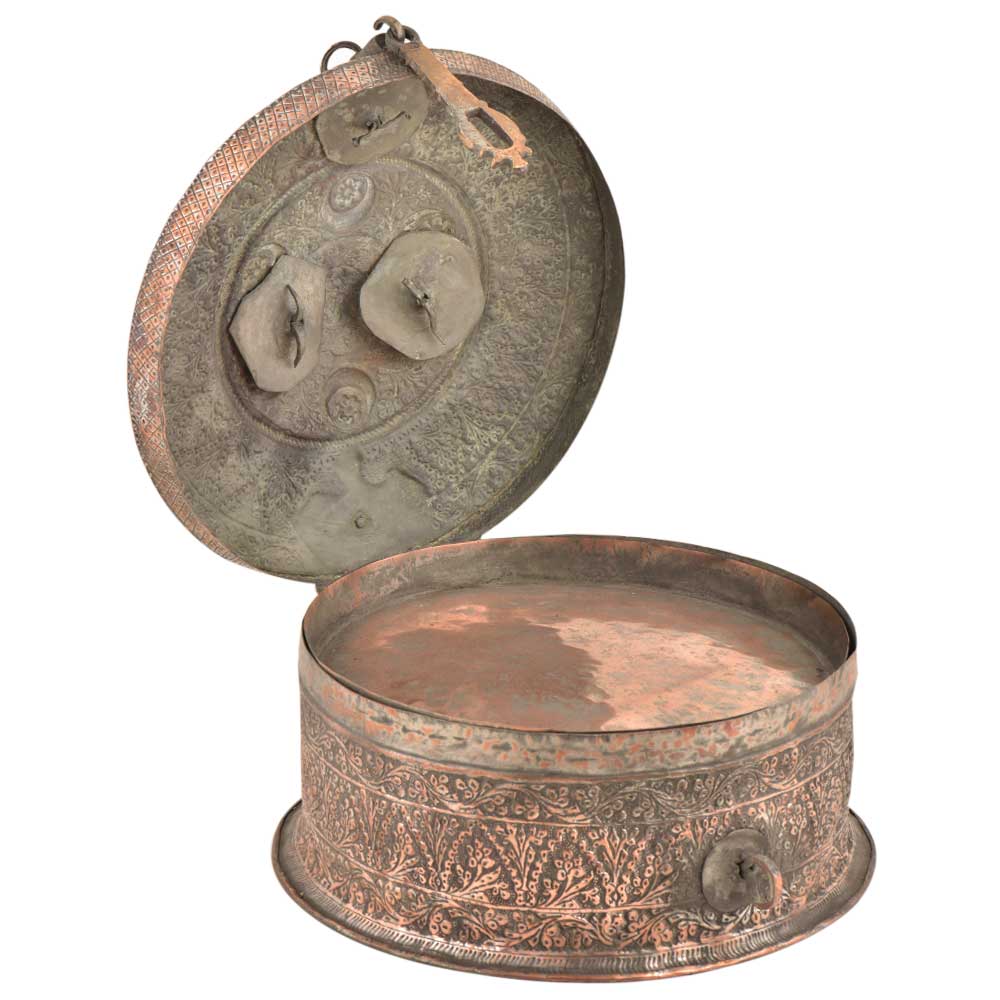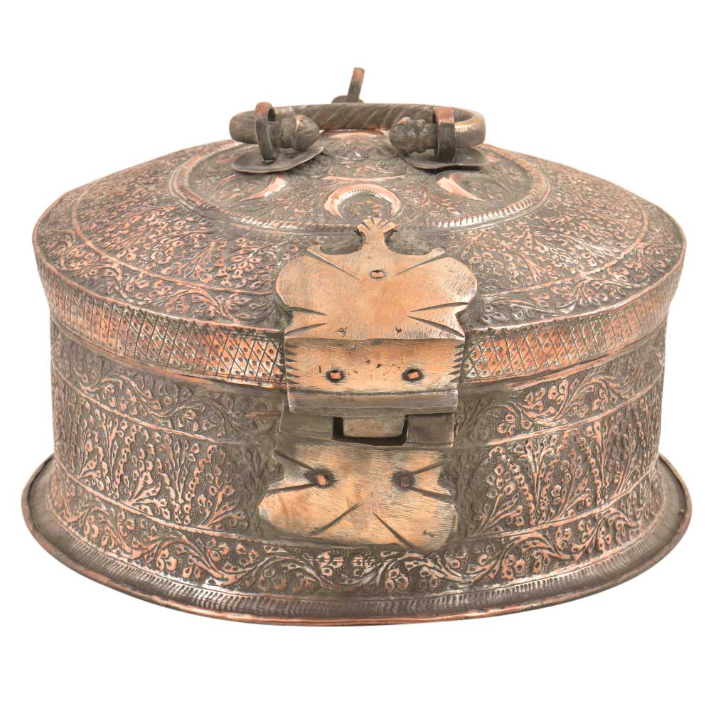 A lovely Big Size Betel or Pandan Box with intricate work done on it . The Box contains a tray, three larger covered round containers, one smaller covered round container, two bowls with stands and two small plates (?). The copper is finely hammered in a detailed floral and vine pattern all throughout the pieces with the exception of the stands and two small plates. It is can also be used as a home décor piece and gift for relatives and friends. Used for storing betel leaf, betel nut, dry tobacco, lime, catchu, and saffron.