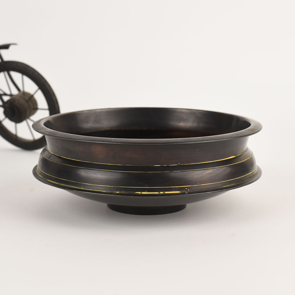 Add rustic elegance to your interior with this round brass urli. Its dark antique finish conveys a sense of history and craftsmanship, while the smooth curved shape invites you to create your own display with water, flowers, or floating candles. Handmade from solid brass, the bowl is both durable and timeless, making it an ideal accent for modern and traditional homes. Use it as a centrepiece for your coffee table, dining table, or entryway console to welcome guests with a serene floral arrangement. The understated design allows it to blend effortlessly with various styles, and its weight lends stability when filled. Each urli may show slight variations in colour and texture, a reminder of the artisanal process behind its creation.