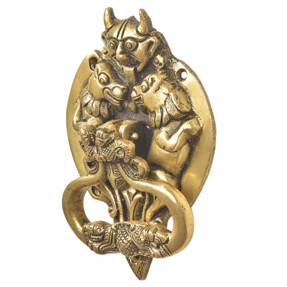 A very solid looking brass door knocker made by expert artisans with the demon face on the top with two Lions on both the sides and the door knocker attached to the dragon face in the centre of door knocker on a broad strike plate. Elegant home decor product.