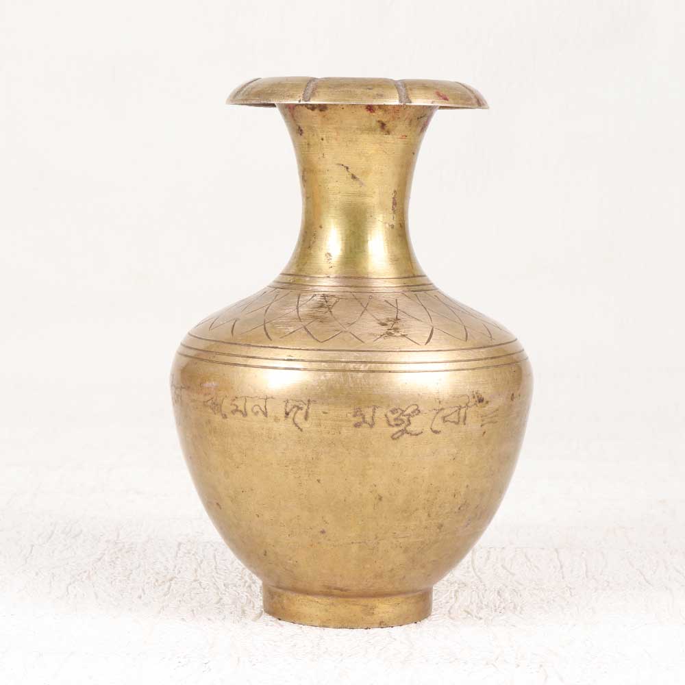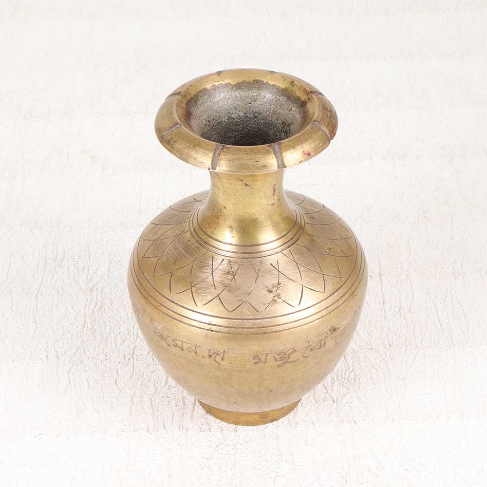 Make a bold, glamorous statement with this ornate vintage-style engraved brass flower pot. Featuring an allover engraving of intricate floral and leaf motifs, this striking pot elevates any space with its luxe golden shine. The solid brass construction lends an air of timeless sophistication, while the handcrafted engraving adds charming artisanal appeal. This pot beautifully displays a bouquet of fresh blooms or your favorite potted plant. For those seeking a decorative accent that is anything but ordinary, this engraved brass flower pot is sure to impress. Place it prominently on an entryway table or console, or allow it to be the shining focal point atop a bookshelf or mantle. Its gleaming brass texture and intricate engraving make a gorgeous addition to both classic and modern decors.