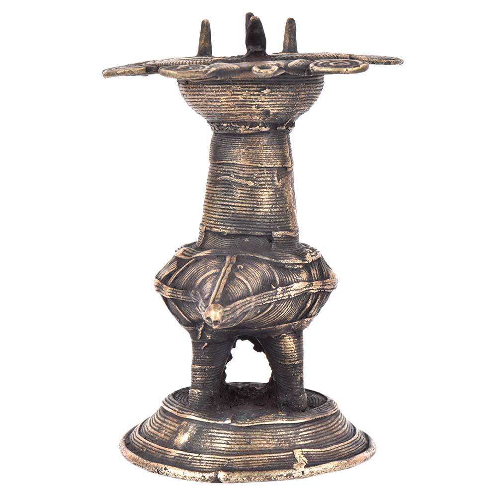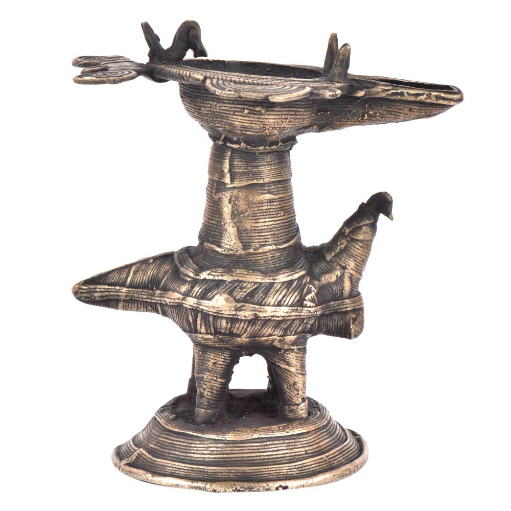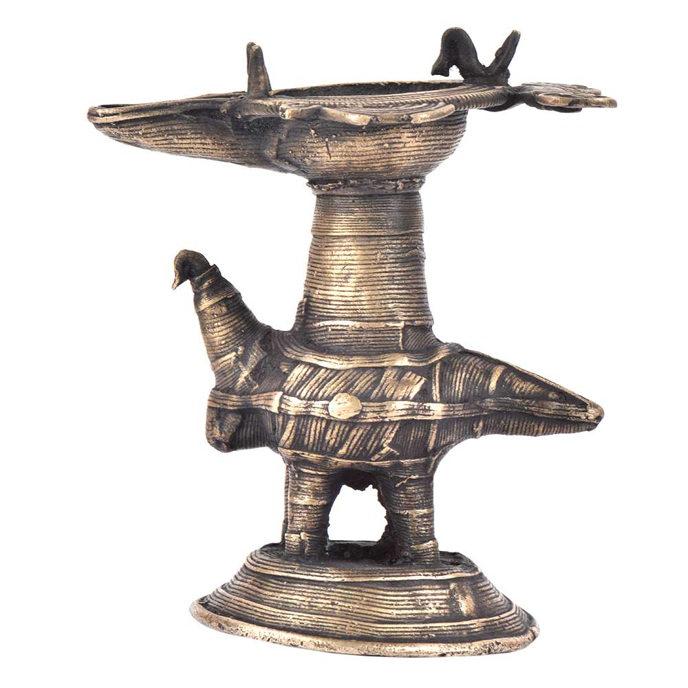 Handcrafted using old lost wax technique primarily practiced in Orrisa and West Bengals by the local or tribal artisans. In this technique the molten wax is poured into desired clay mould and when the wax melts the clay is broken and we get the desired metal object which is further polished to perfection. The Deep Cup Can Be Filled with Oil and Light a Cotton Wick. Diyas/ Oil Lamps are Considered Auspicious as in Hindu Religion. It is detailed with Elephant and Peacock Animals with Beautiful Details.