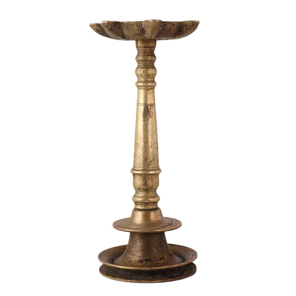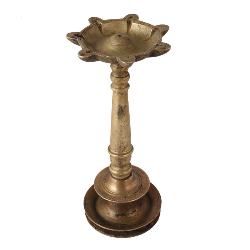 A handmade oil lamp made of a brass alloy for decorating a home, office or store. Brass oil lamps have been used for centuries to light homes during power outages. With ghee or mustard oil and cotton wicks, 7 jyots can be lit at the same time to light up the house, office, restaurant or hotel. Its rugged appearance and unique design will make it an eye-catcher for your guests and visitors, and a must-have for your vintage art collection. This fascinating find is a treat for vintage collectors and a perfect gift for your family or friends on special and festive occasions.