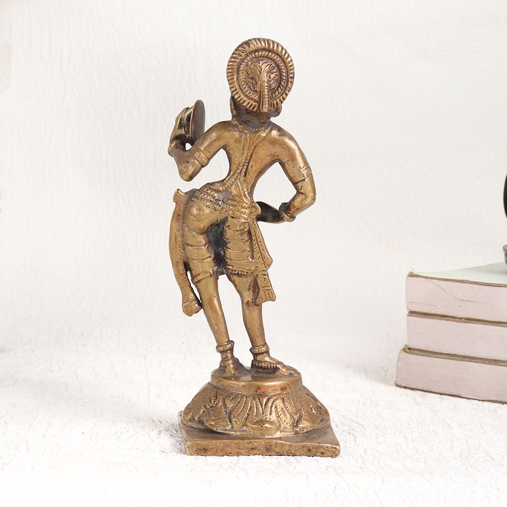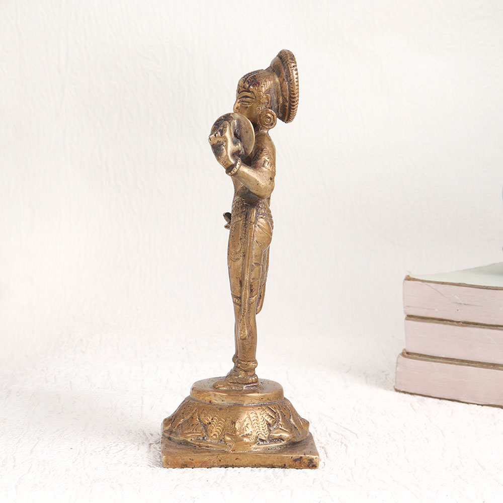 Adorn your decor with the timeless elegance of this exquisite brass statue of standing lady. Crafted by highly skilled Indian artisans, this stunning piece captures the essence of sophistication and artistry. Standing on a platform, a graceful lady gazes into a handheld mirror, her poise and beauty frozen in time. The antique brown finish lends an air of vintage charm, making it a perfect addition to any setting - be it your home, office, restaurant, hotel, cafe, or shop. Its versatile design seamlessly blends with various decor styles, adding a touch of class to any space. This handmade masterpiece is created using high-quality brass, ensuring its durability and exquisite detailing. Whether you're an avid collector or looking for a unique accent piece, this statue is a must-have. Showcase it at exhibitions or simply use it to adorn your living space. Moreover, it makes for a thoughtful gift for your family, friends or relatives on special, festive, or auspicious occasions, symbolizing beauty, artistry, and the rich heritage of Indian craftsmanship. Bring home this remarkable brass statue and infuse your surroundings with timeless allure.