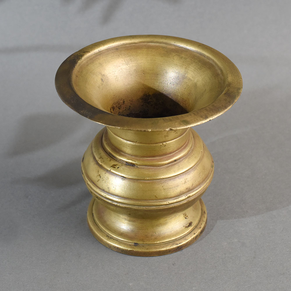 This traditional brass holy water pot is a stunning example of Indian ritual craftsmanship, used in Hindu religious practices to hold and offer Gangajal or Theertham (holy water). Meticulously shaped from solid brass, the pot features a beautifully tiered design with a broad, flared rim, a pronounced midsection, and a strong, stable base. Its symmetrical form and smooth finish highlight both functional utility and sacred symbolism. The unique stepped contours of the body are typical of classical Indian temple art, where each curve signifies balance and purity. This vessel is commonly used during puja, abhishekam, and temple ceremonies, symbolizing sanctity and spiritual cleansing. The warm golden hue and natural patina further enrich its aesthetic, giving it a timeless, antique appeal.