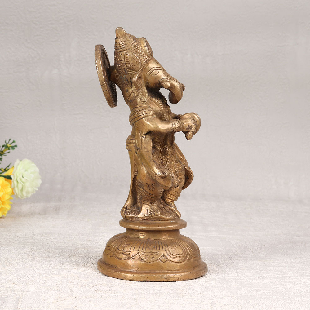 Enhance your prayer room with the divine presence of this exquisite Brass Lord Ganesha statue that is a testament to Indian craftsmanship and spirituality. Meticulously handcrafted by highly skilled artisans in India, this stunning piece features Lord Ganesha, the remover of obstacles, standing in a commanding pose while playing the cymbals. The statue boasts a rich antique brown finish, adding a touch of vintage elegance to any environment. Crafted from high-quality brass, the intricate details and fine craftsmanship showcase the dedication of the artisans who poured their skill and passion into creating this masterpiece. Versatile in its placement, this statue is a harmonious addition to your home, office, restaurant, hotel, or cafe prayer room, creating an atmosphere of tranquillity and positivity. This exceptional work of art isn't just a decorative piece, it's a symbol of blessings and auspiciousness. Embrace the cultural richness and spiritual significance of Lord Ganesha, and consider adding this statue to your vintage collection. Moreover, it makes for a thoughtful and meaningful gift for your family, friends or relatives on special, festive, or auspicious occasions, sharing the divine energy and cultural heritage embodied in this handcrafted creation.