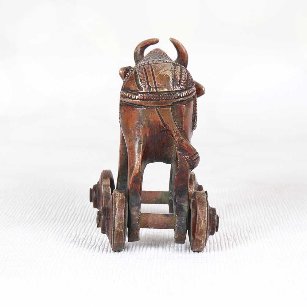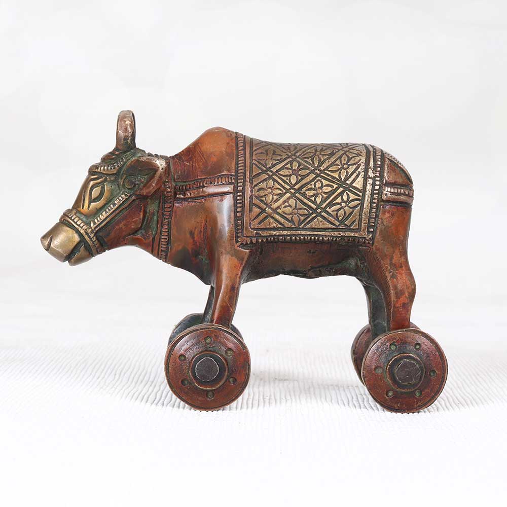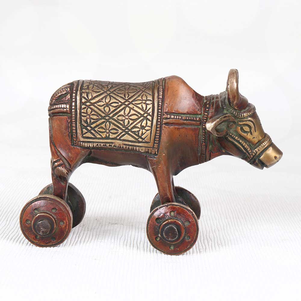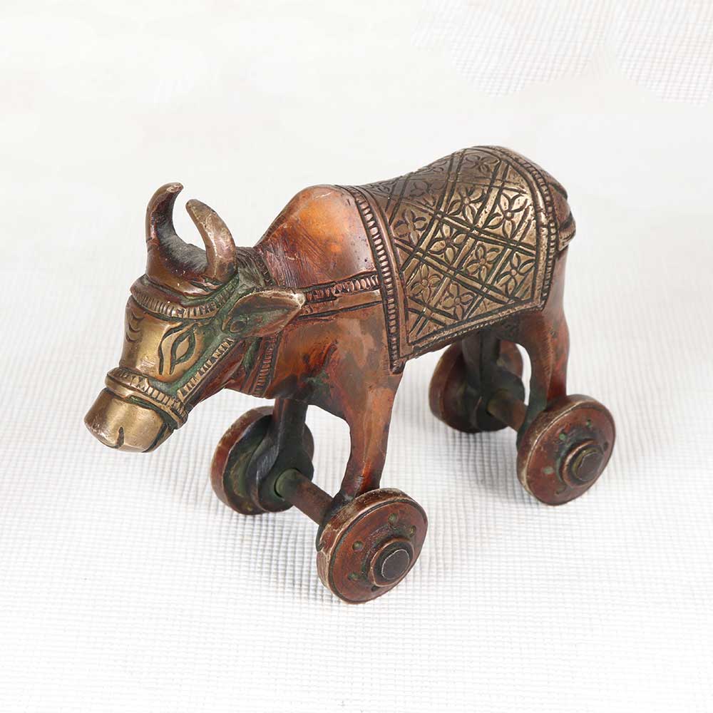Travel back in time with this antiqued brass bull on wheels, handcrafted in Central India using traditional techniques. This mesmerizing brass bull captures India's rich history of metal handicrafts. The delicate patterning and detailed casting reflect the care and skill poured into its creation. Display this conversation-starting piece to add nostalgic flair to any room. Its vintage design and quality craftsmanship make this wheeled bull a special addition to any home. Surprise your guests with this whimsical decor that evokes the elegance of eras past. For collectors and decor enthusiasts who appreciate artisanal handicrafts and decor with vintage appeal, this antiqued brass bull is a charming find. Let its nostalgic charm and delicate details transport you.
