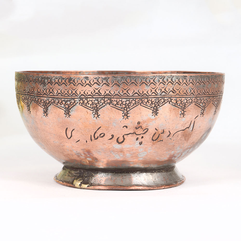 Adorn your interior with the timeless charm of our Vintage Copper Bowl that is a masterpiece of Islamic Art crafted by skilled artisans. Imbued with the rich cultural heritage of meticulous craftsmanship, this bowl is a testament to the artistry that flourished in the Islamic world. The antique brown finish exudes an aura of sophistication, adding a touch of opulence to any space. Handmade with precision from high-quality copper, each bowl is a unique creation, showcasing intricate engravings that tell a story of tradition and artistry. Its versatile design allows it to seamlessly fit into various settings, be it at home, in the office, a restaurant, hotel, or cafe. The bowl's multi-functional appeal makes it suitable for both decoration and practical use, doubling as an indoor flower pot for a refreshing botanical display. An ideal addition to any vintage collection, this Copper Bowl serves as a distinctive statement piece, capturing the essence of bygone eras. Thoughtful and meaningful, it makes for a splendid gift to cherish, bestowed upon your family, friends or relatives during special, festive, or auspicious occasions. Embrace the beauty of the past with this exquisite vintage creation that transcends time and tradition.