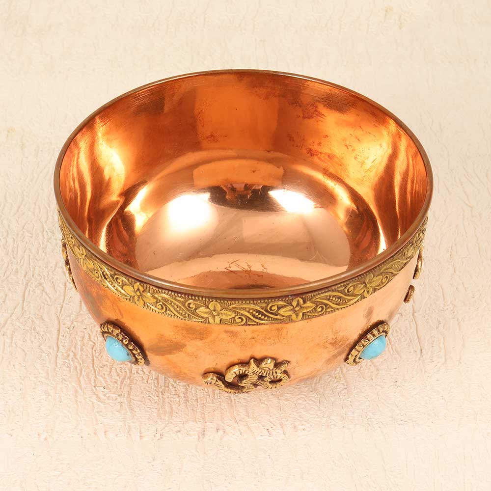 This stunning handcrafted copper brass bowl beautifully embodies the artistry of Nepalese metalwork. Skilled artisans use traditional techniques to transform simple metals into intricate works of art for your home. The hammered design gives a mesmerizing texture while the metallic sheen adds luxury feel. Display in your living room to elevate your decor with Nepalese flair. Fill with fresh fruit or use it as an elegant catch-all bowl in your entryway. However, you use it, this bowl brings artistic, handmade appeal to your home. Cherish a piece of Nepal in your home with this gorgeous copper brass bowl. It's quality construction and beautiful design create an heirloom you'll value for years.