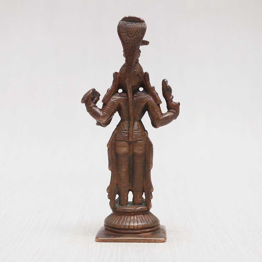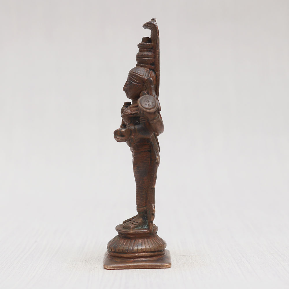 Embrace the divine presence with the exquisite Hindu Goddess Mariamman Copper Statue, a masterpiece crafted by highly talented Indian craftsmen. Standing gracefully on a platform, this statue radiates spiritual energy, meticulously handmade from high-quality copper with a vintage-style finish. Perfect for your prayer room at home, office, restaurant, cafe, or shop, its eye-catching detailing adds a touch of elegance and charm to any space. This captivating copper statue serves as an ideal showpiece for exhibitions, decorations, and collections, showcasing the finest artistry. With a sacred aura, it finds its place in temples for worship. Celebrate special occasions by gifting this divine creation to your loved ones, making it an auspicious and unforgettable present. Step into the realm of divine beauty and culture as you explore the finest Hindu god statues to buy on our website.