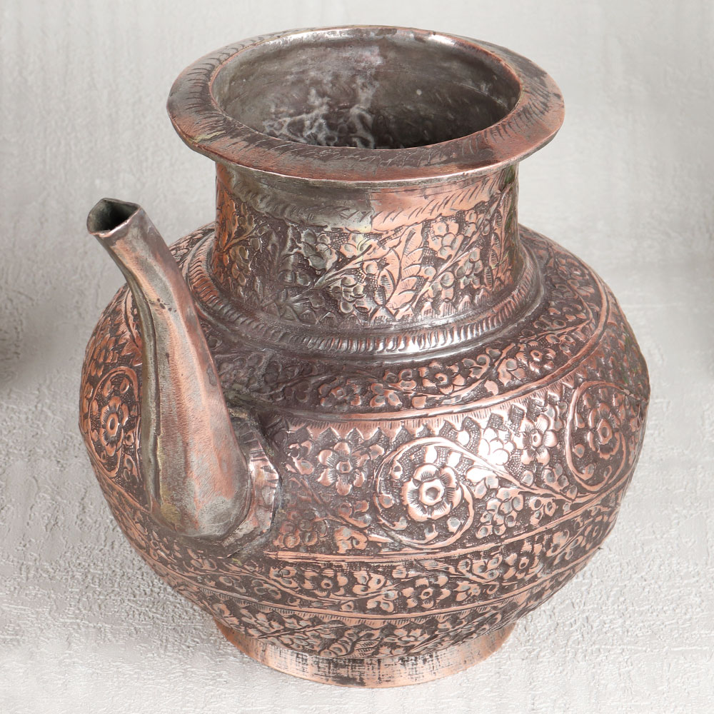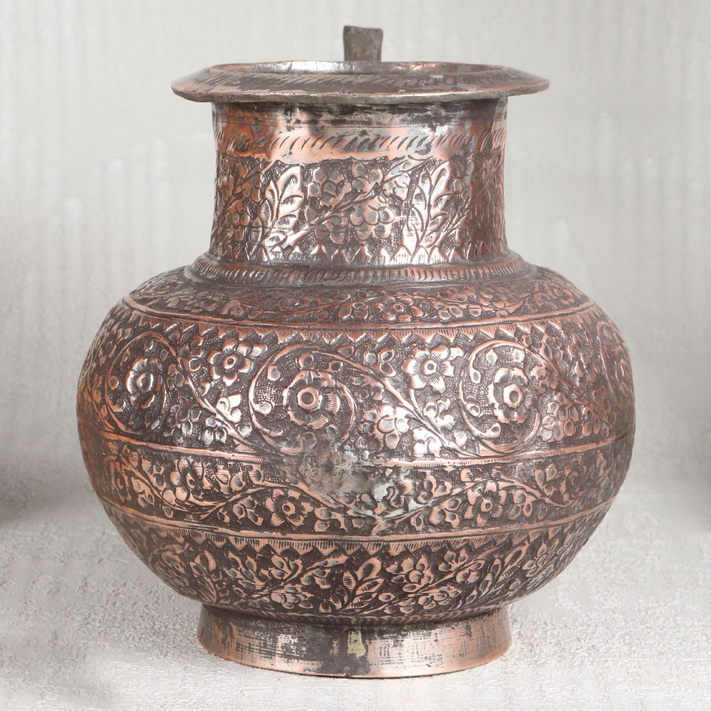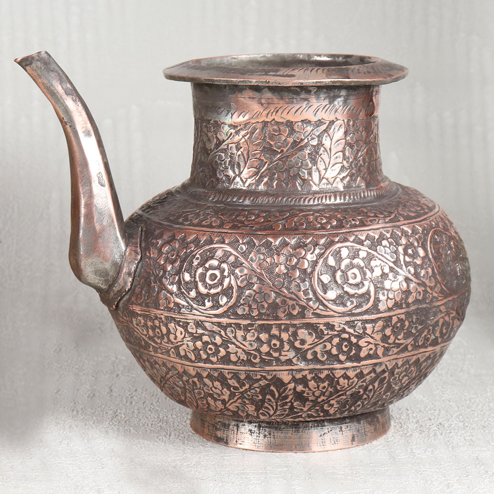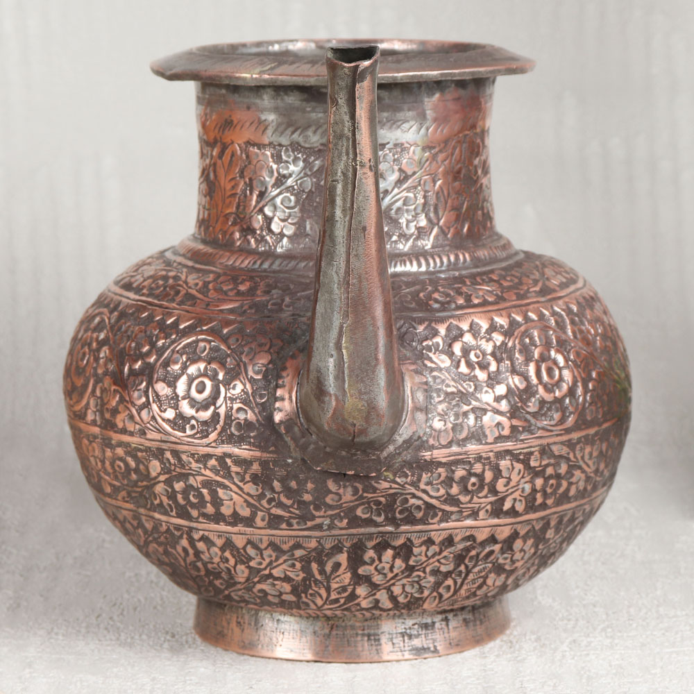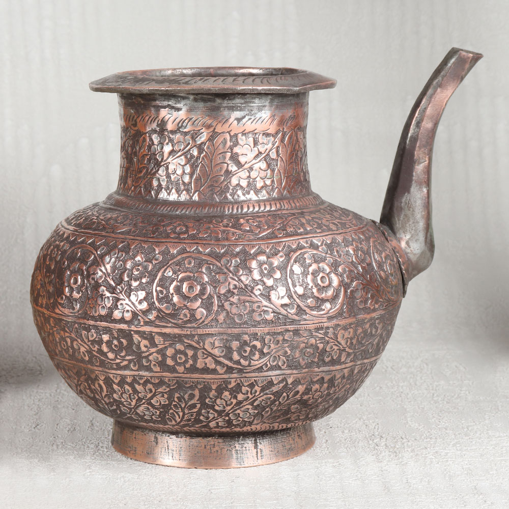Buy an Antique Brown Copper Water Pot with Engraved Designs which is meticulously handcrafted by highly skilled Indian artisans hailing from the heritage-rich city of Hyderabad. This stunning piece of artistry is the epitome of elegance and functionality, a testament to the timeless beauty of Islamic Art. Crafted from the highest quality copper, this pot exudes a warm and inviting antique brown finish that adds an air of sophistication to any setting. The intricate engravings adorning its surface showcase the artisan’s dedication to detail, making it a mesmerizing work of art in itself. Versatile in purpose, this copper pot is suitable for a multitude of settings. Place it in your home, office, restaurant, hotel, or cafe to elevate the ambiance with its unparalleled charm. It can serve as a stunning decorative piece, a flower pot, or even hold holy water for rituals, imbuing sacred moments with a touch of opulence. Moreover, this exquisite pot makes for an ideal gift on special, festive, or auspicious occasions, allowing you to share the beauty of Indian craftsmanship with your family, friends or relatives. With its timeless appeal and multifaceted utility, the Antique Brown Copper Water Pot is a true treasure that transcends generations.