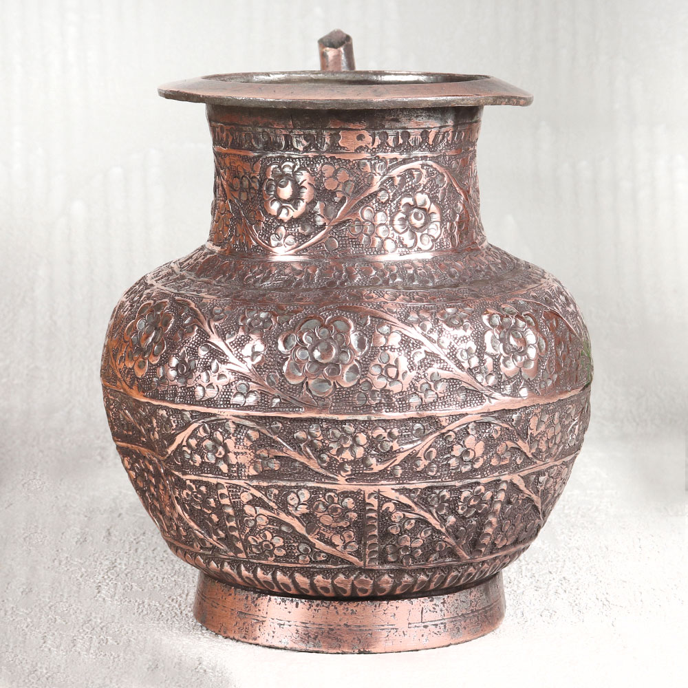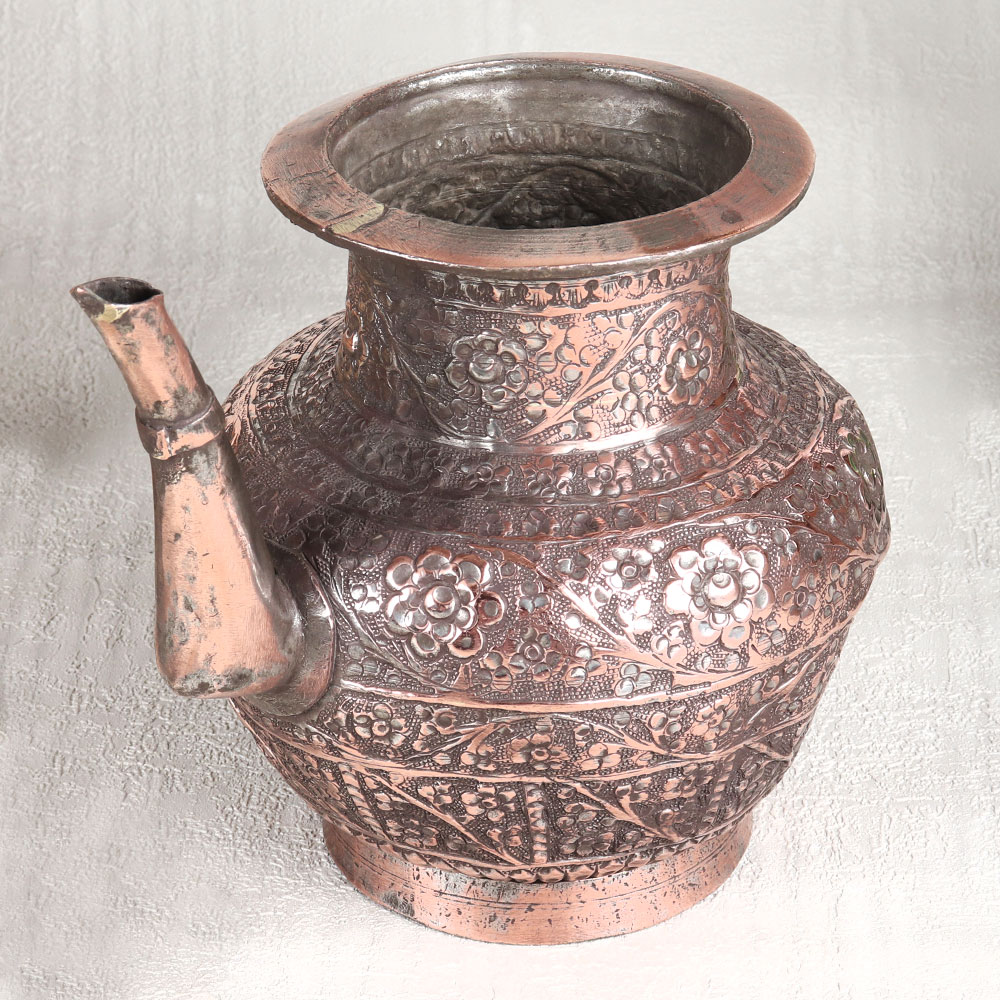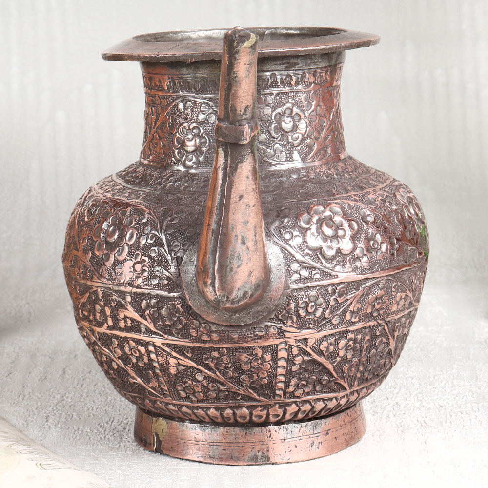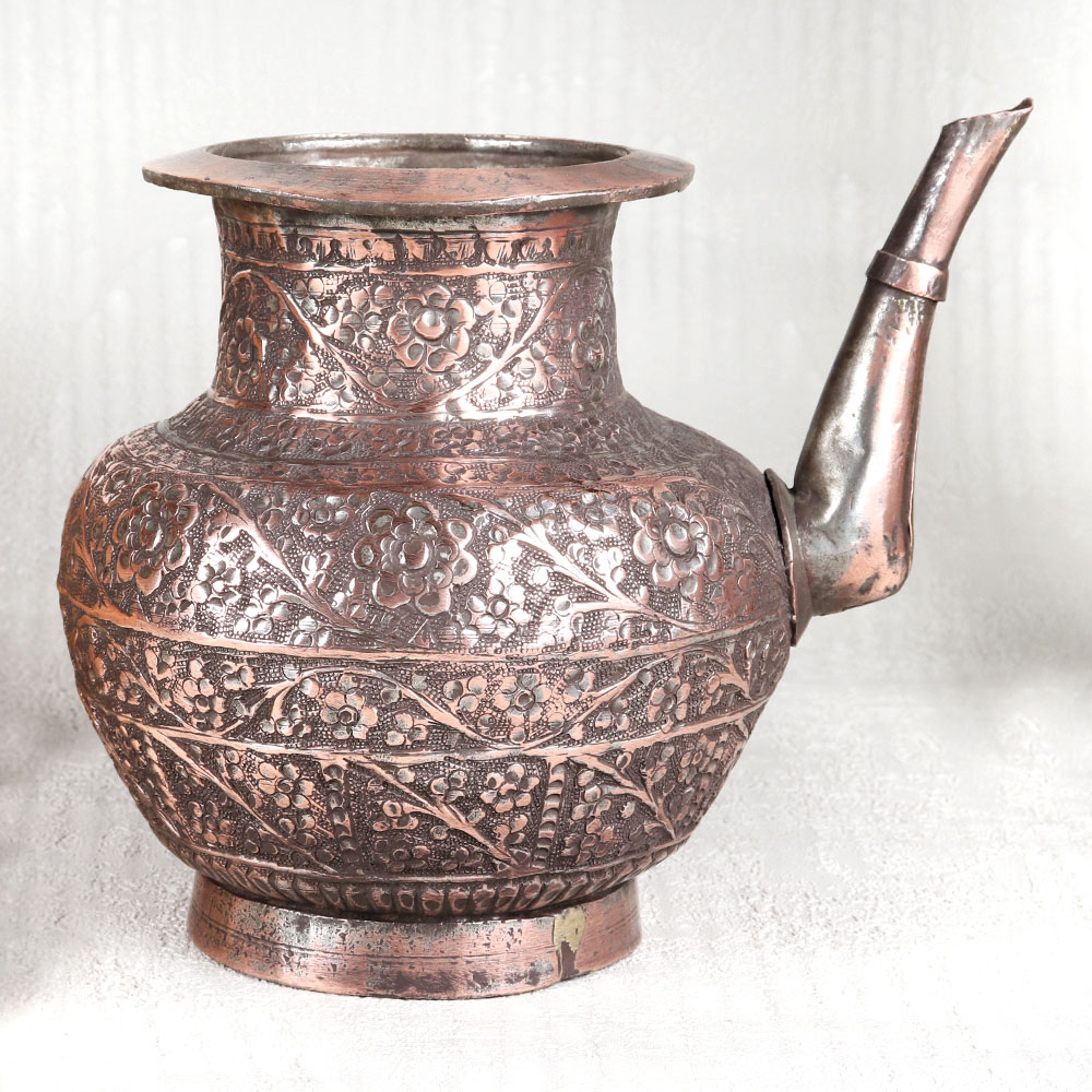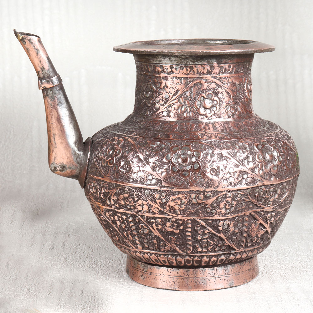 This Vintage Copper Water Pot with Spout is a true masterpiece of craftsmanship and artistry. This stunning piece boasts an antique brown finish that exudes timeless elegance, making it a captivating addition to any space. Its surface is adorned with intricate engraved designs, each a testament to the skill and dedication of Indian artisans from Hyderabad, renowned for their mastery of Islamic Art. Handcrafted with meticulous attention to detail, this water pot is a symbol of tradition and heritage. Made from high-quality copper, it not only serves as a striking decorative piece but also holds great significance in religious and spiritual contexts. Whether placed in a home, office, restaurant, hotel, or cafe's prayer room, it emanates an aura of reverence and aesthetic charm. For those seeking vintage collectibles or planning to exhibit their treasures, this copper water pot is a must-have. Its uniqueness and historical allure will undoubtedly captivate the hearts of enthusiasts and collectors alike. Furthermore, it makes for a thoughtful and meaningful gift for your family, friends or relatives on special, festive, or auspicious occasions. Embrace the rich history and artistry of India with this Vintage Copper Water Pot, a timeless testament to the craftsmanship of skilled artisans and a true embodiment of beauty, culture, and tradition.
