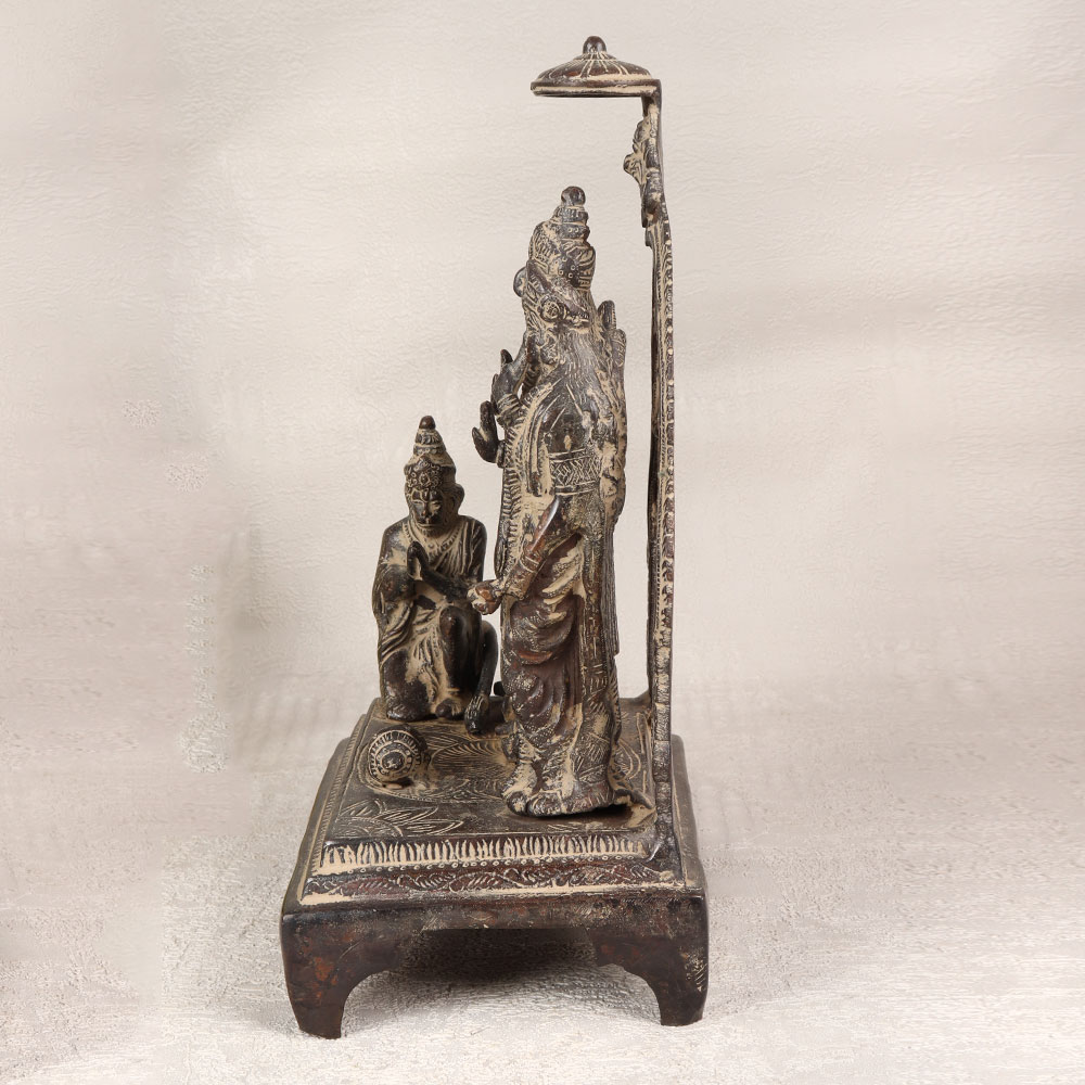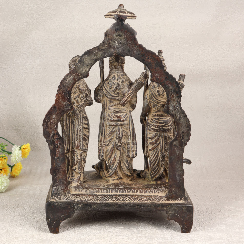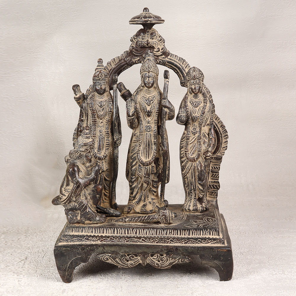 Buy a Brass Ram Darbar statue online which is a testament to Indian craftsmanship and devotion. Standing at the heart of this magnificent piece is Lord Ram, radiating divine grace and authority. Flanking him are the loyal siblings - Lord Laxman on the right and the epitome of purity, Goddess Sita, on the left. The ensemble is completed with the devout Lord Hanuman, seated in the namaskar mudra, symbolizing unwavering devotion. Handcrafted by highly skilled Indian artisans, this masterpiece is meticulously shaped from high-quality brass, offering a timeless and antique dark finish. The attention to detail and craftsmanship makes it a striking addition to any home, office, restaurant, hotel, or cafe prayer room. Its versatile charm extends to becoming a prized vintage collection item. Share the blessings and positive energy by gifting this Brass Ram Darbar to your family, friends or relatives on special, festive, or auspicious occasions. Let the divine aura and cultural richness of this artwork bring serenity and joy to any space it graces. Embrace the divine connection and aesthetic beauty with this truly remarkable piece.